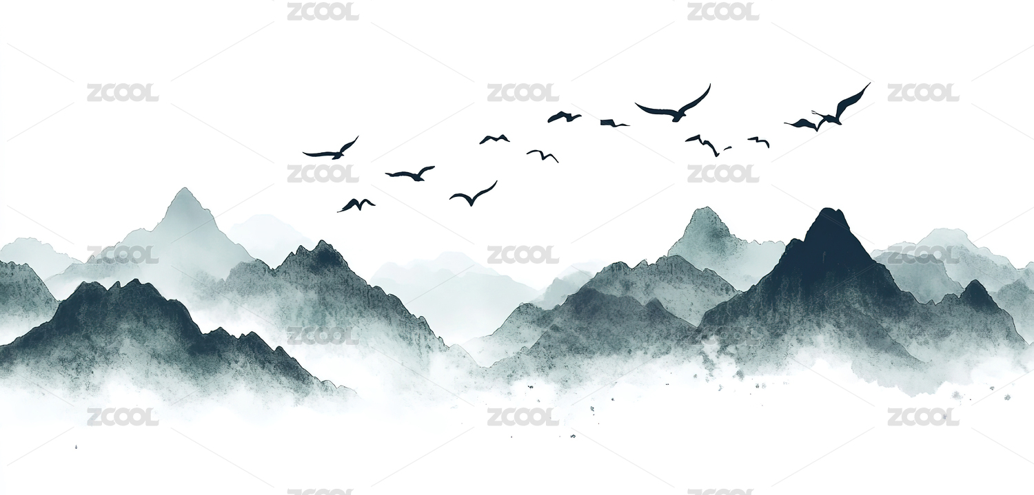 高山,自然,雾,风景,插画,中国画,中国文化,鸟类,自然美,天空