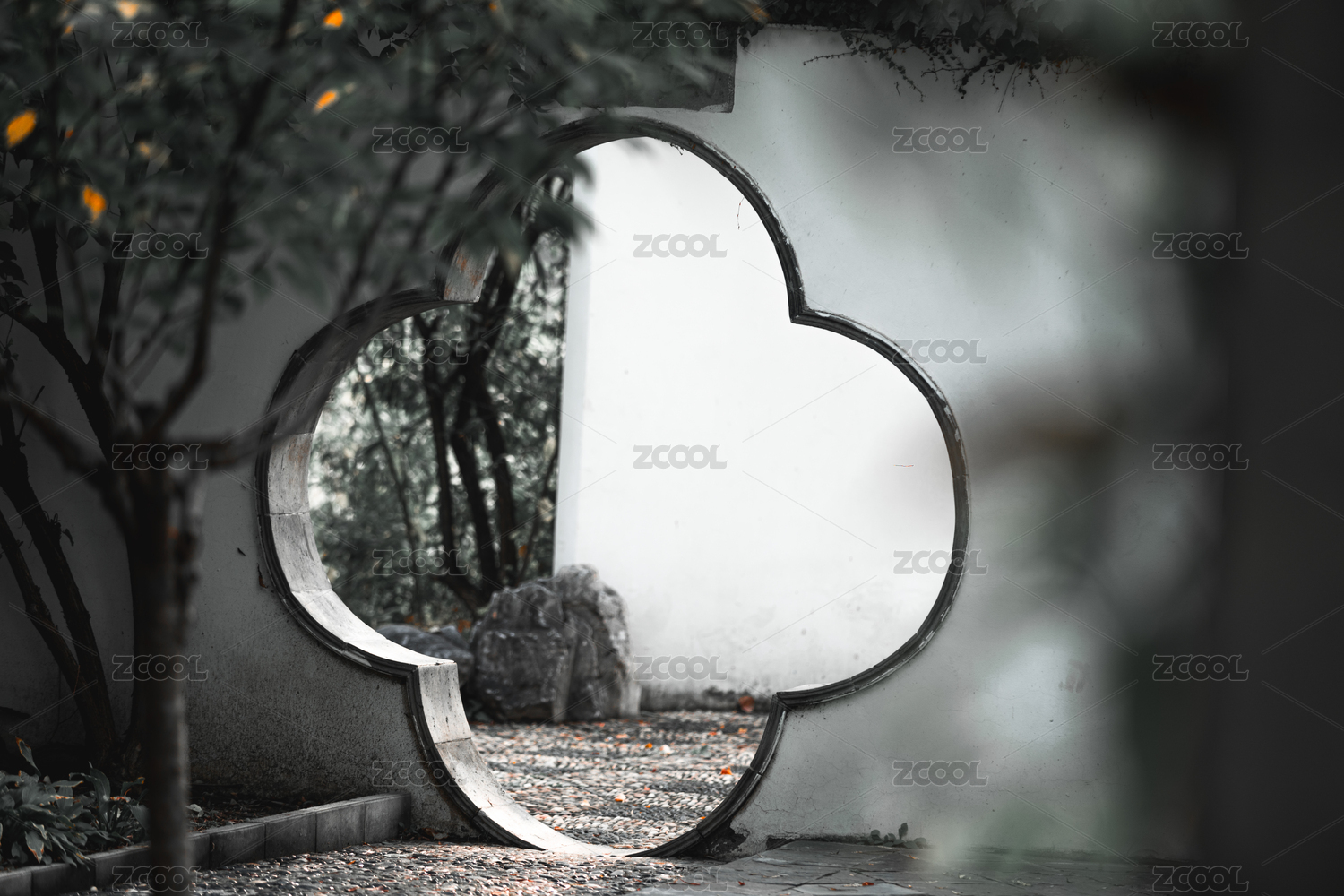 园林中的白墙中式窗户