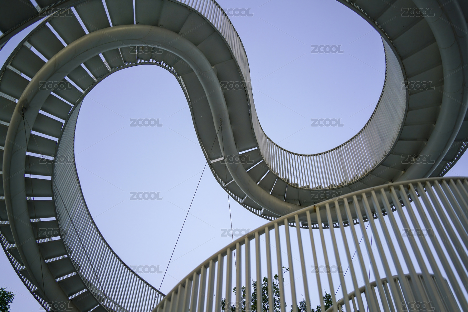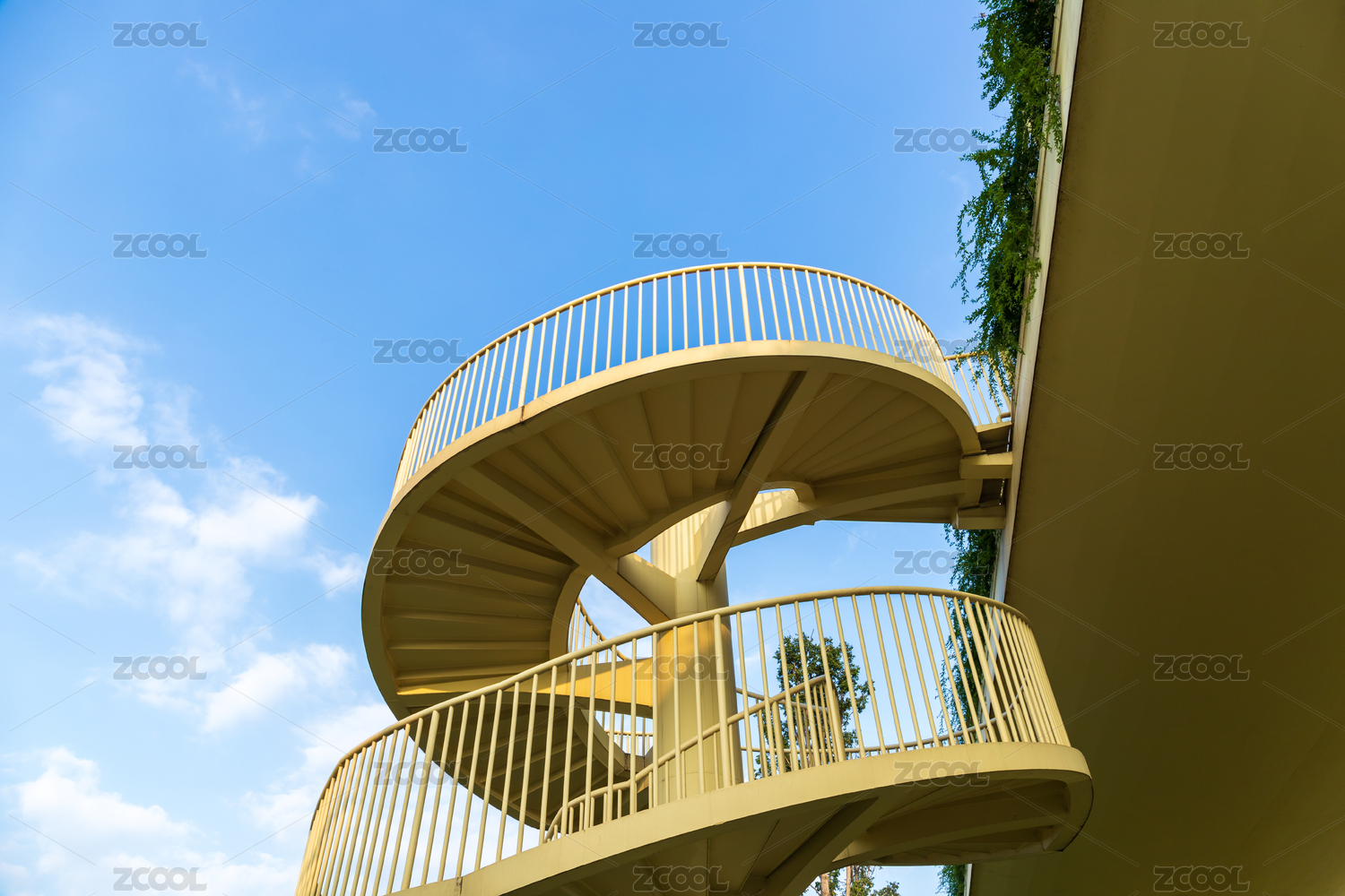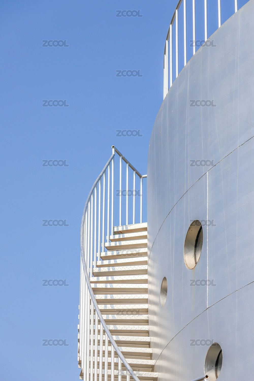 蓝天白云背景中的螺旋状楼梯护栏