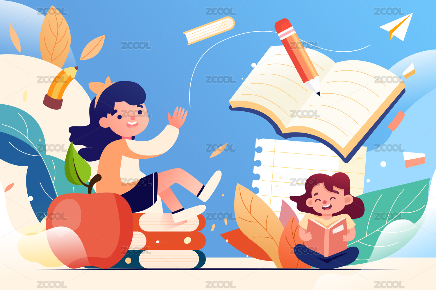 两个小朋友在打开书和文具前庆祝开学的插画