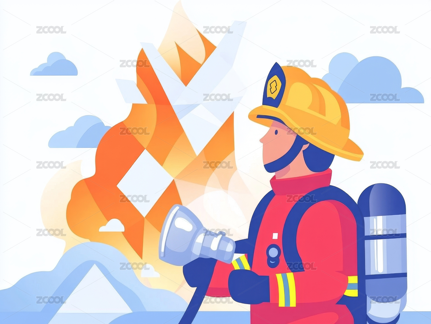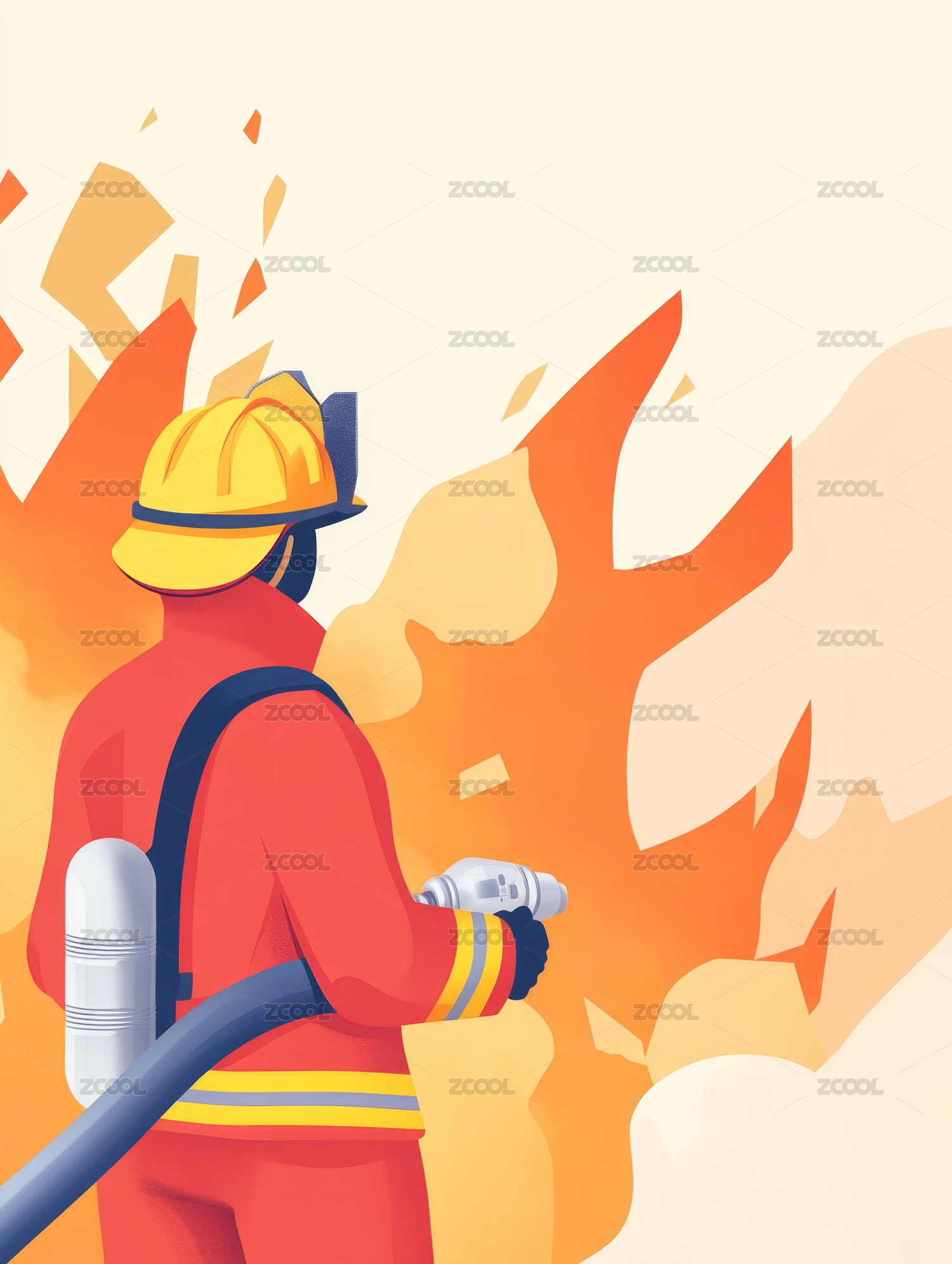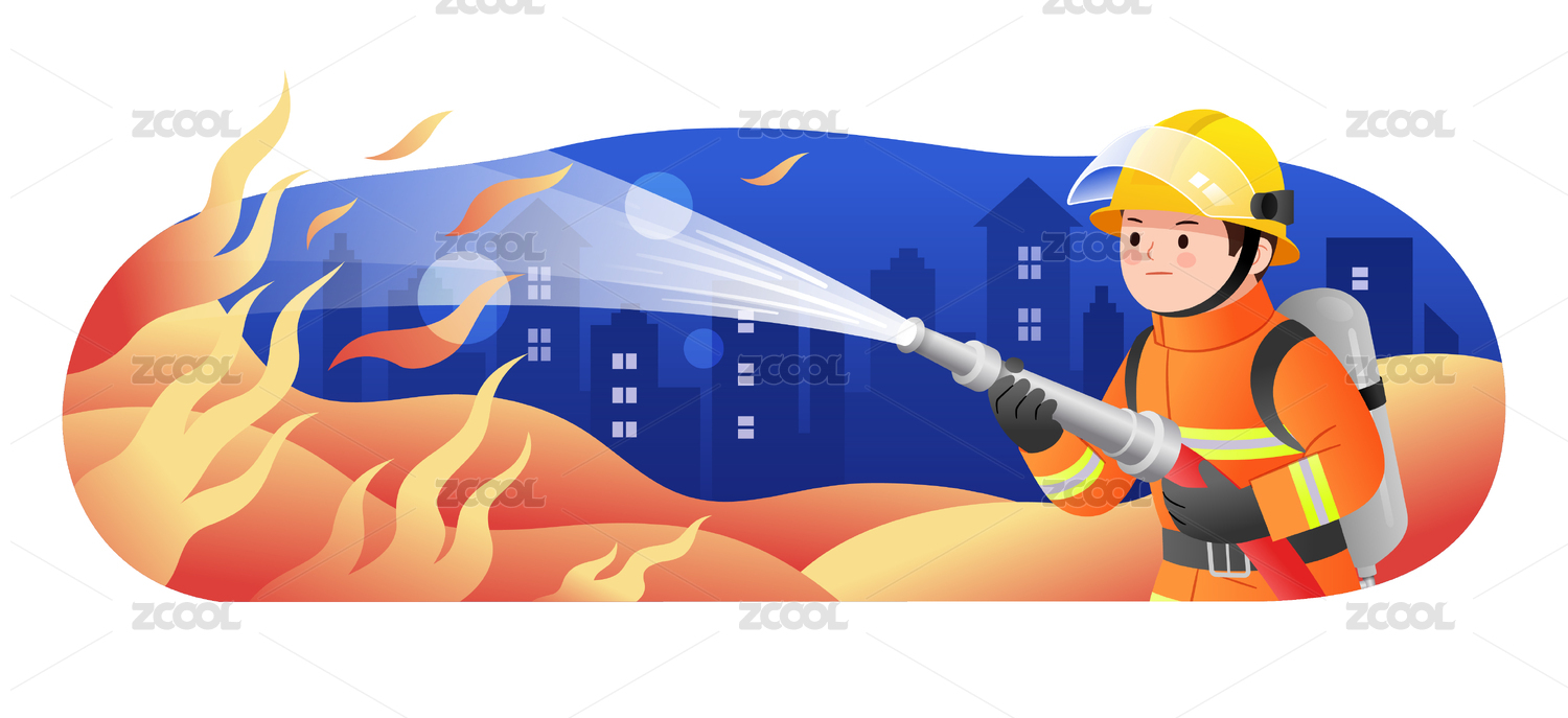 拿着高压水枪灭火的消防员插画横版