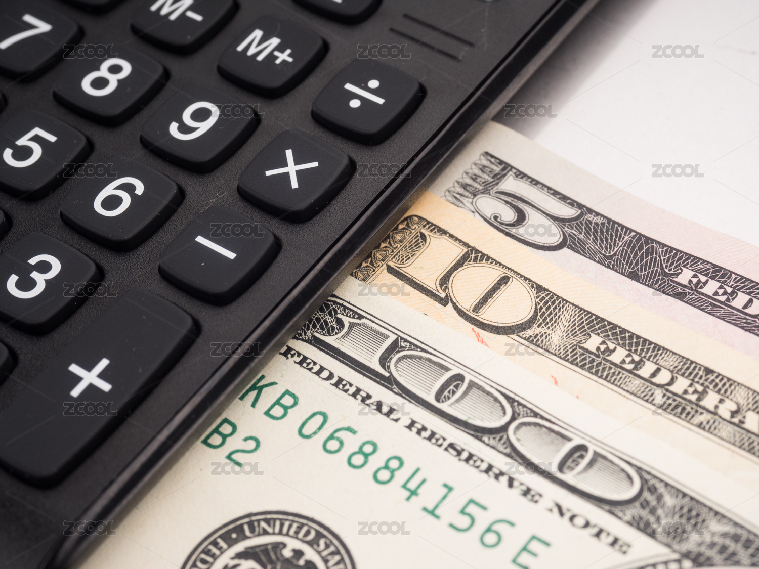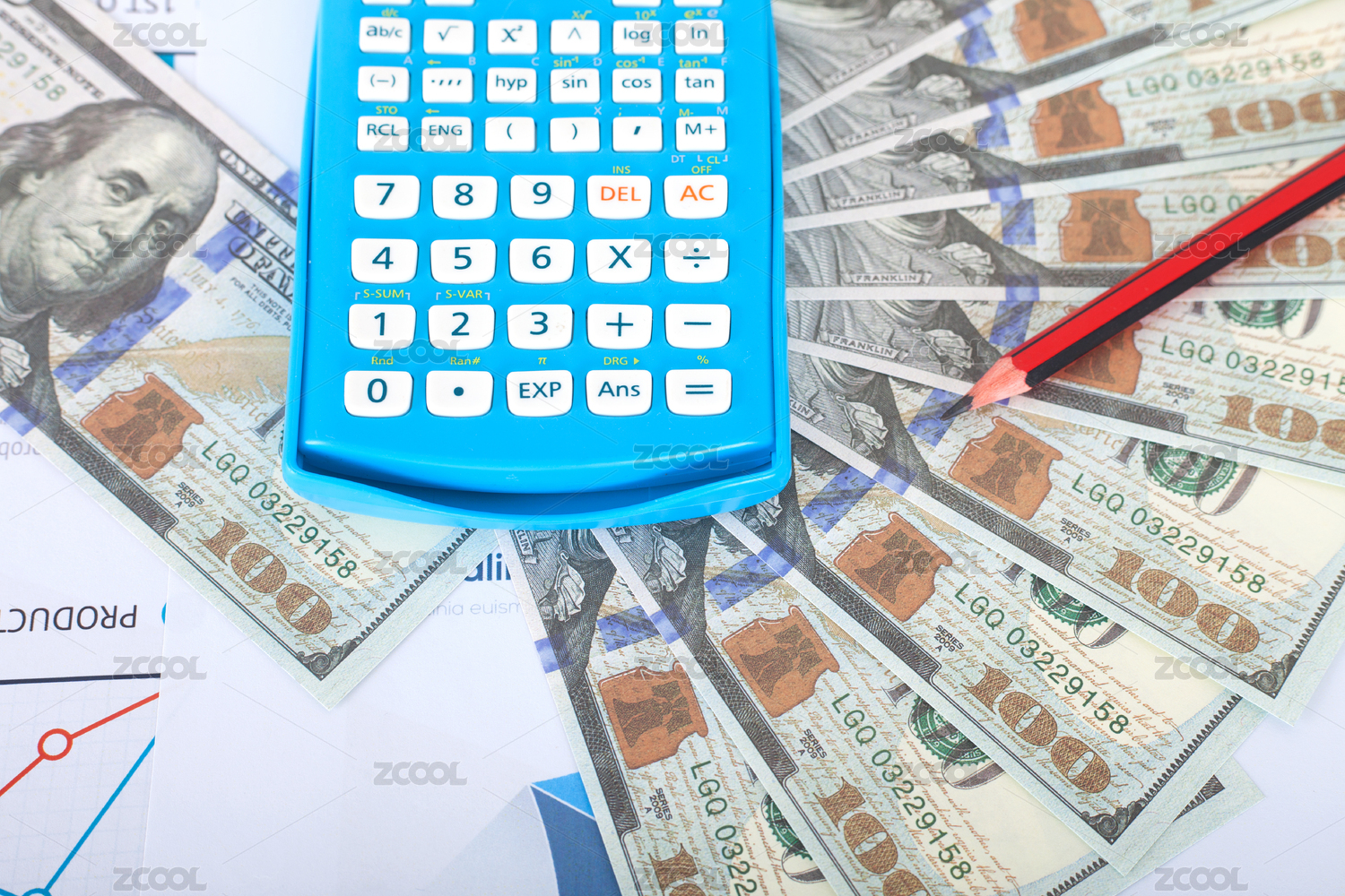 金融相关的美元钞票和计算器及铅笔