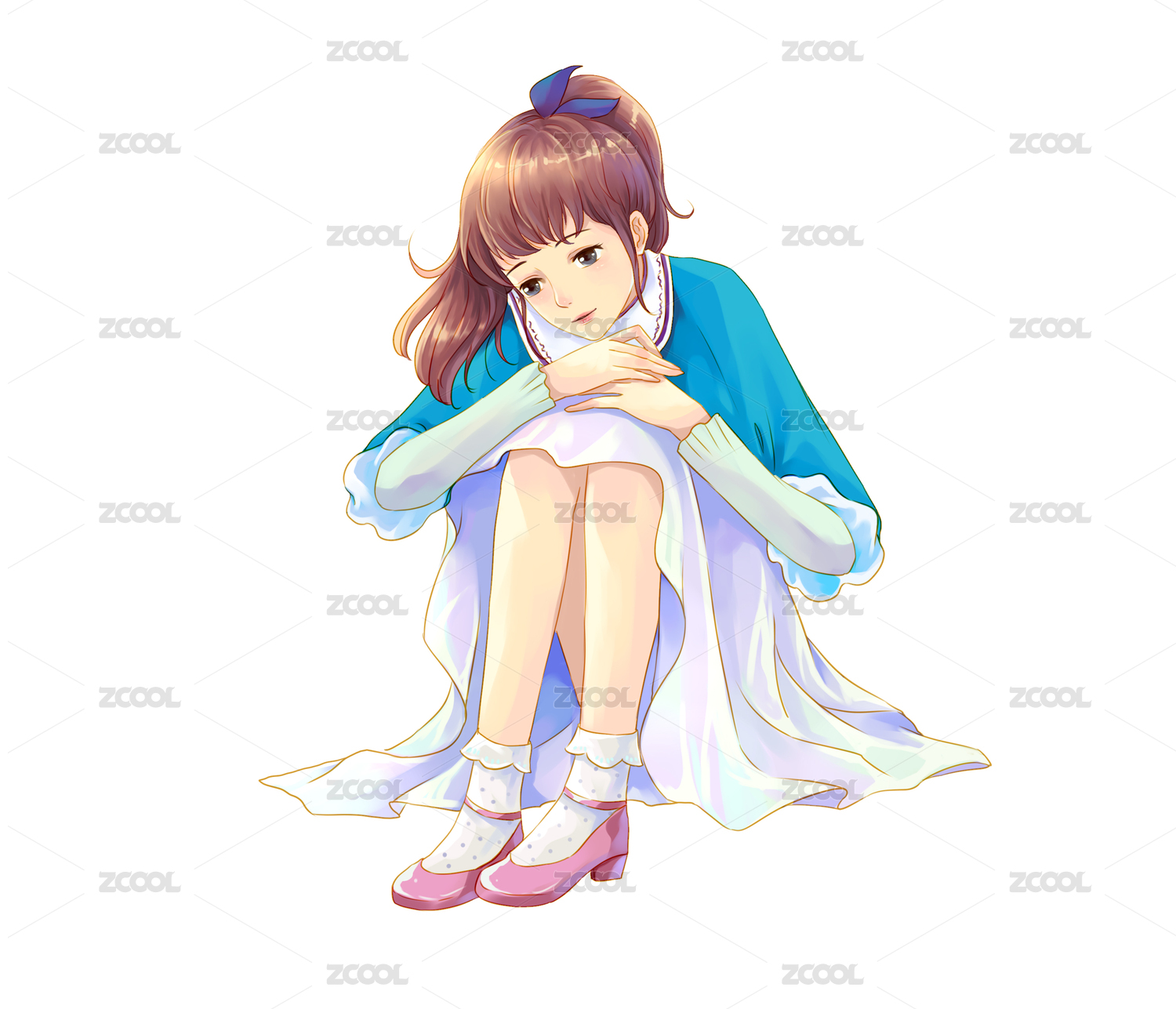 穿黄色连衣裙的二次元少女坐姿 手绘插画