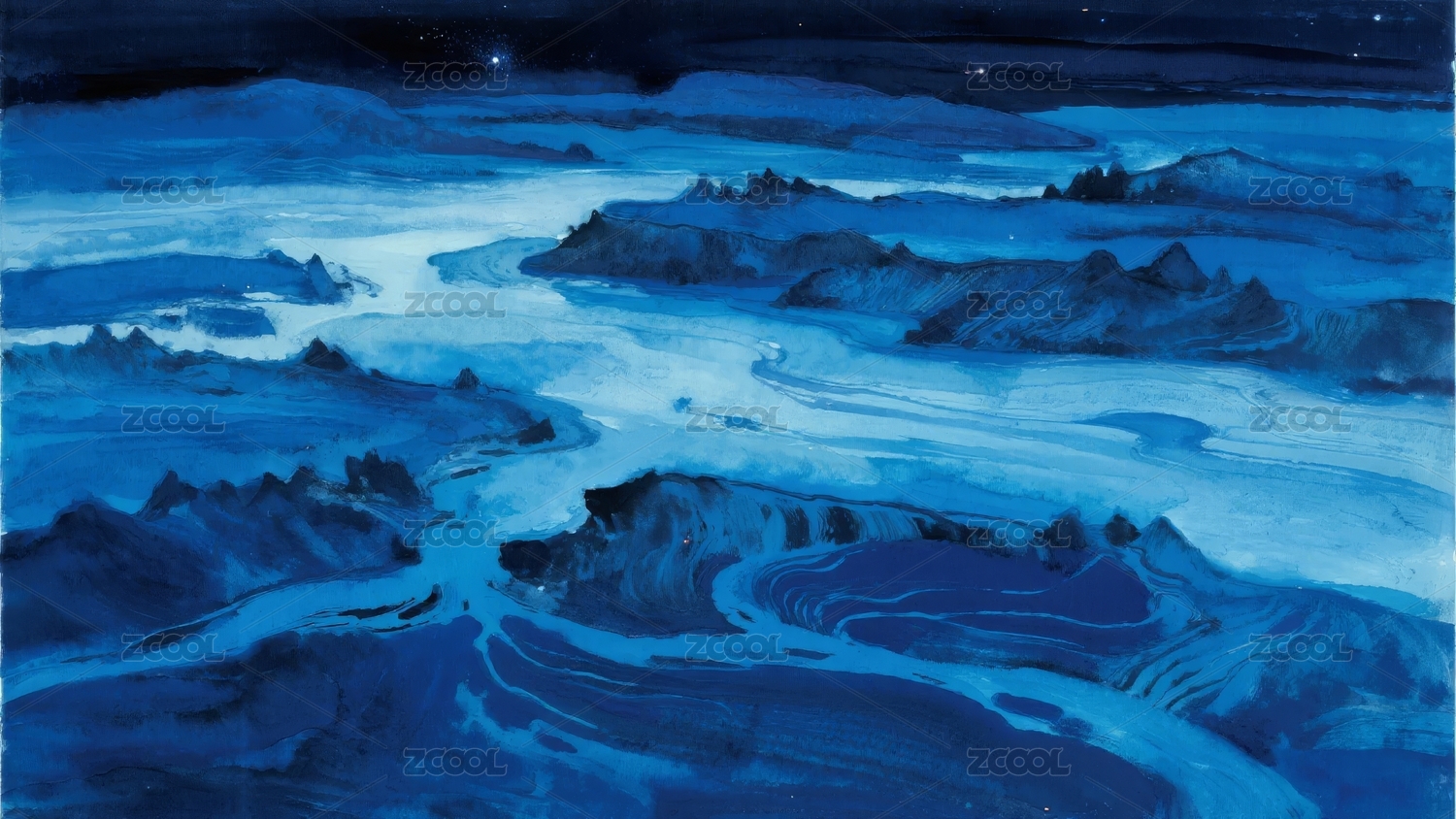 蓝调山河水墨画卷