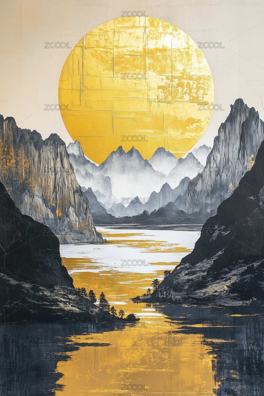 金丝描边的水墨山川风景插画海报背景