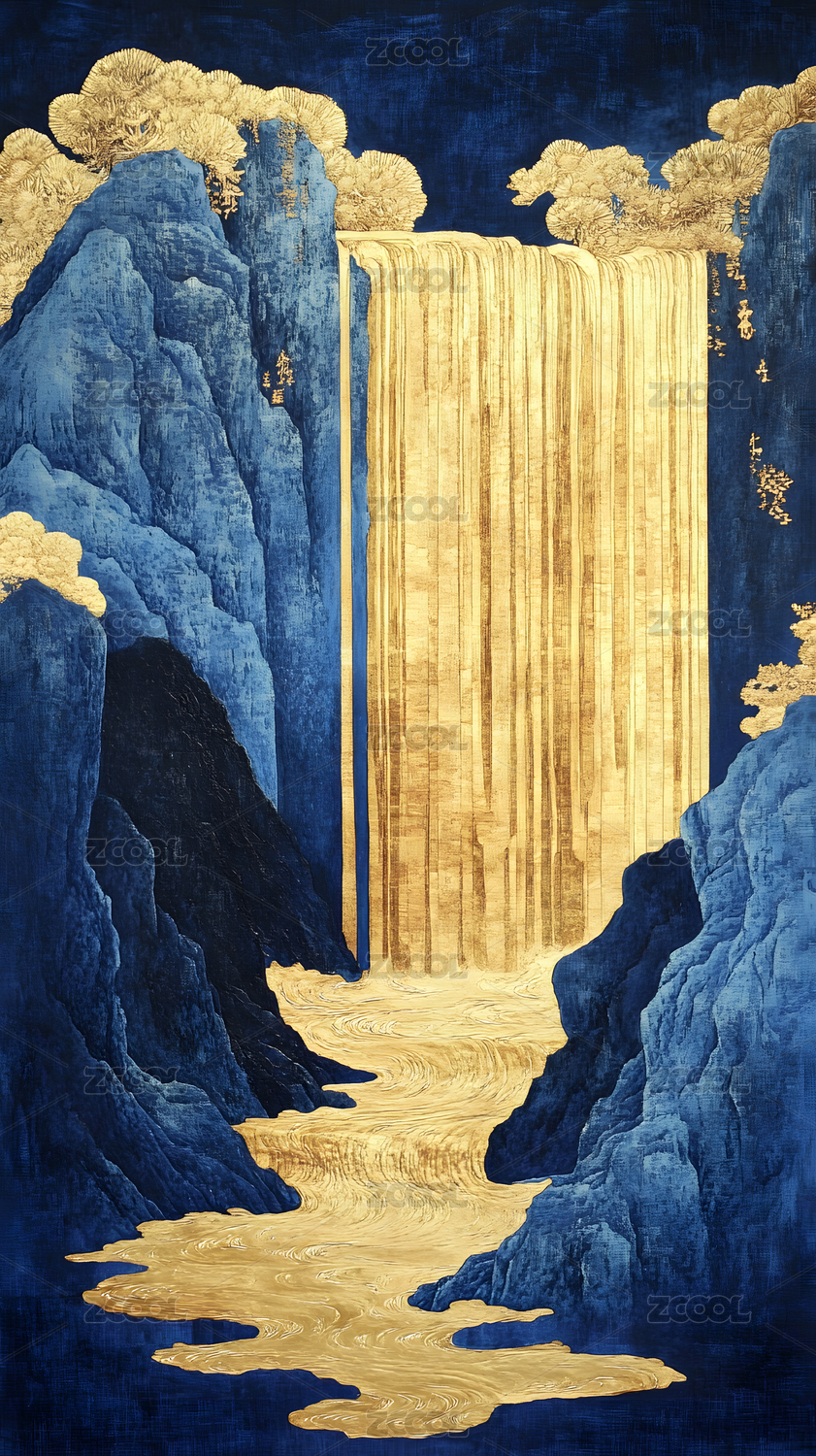 金色瀑布蓝色山谷意境图