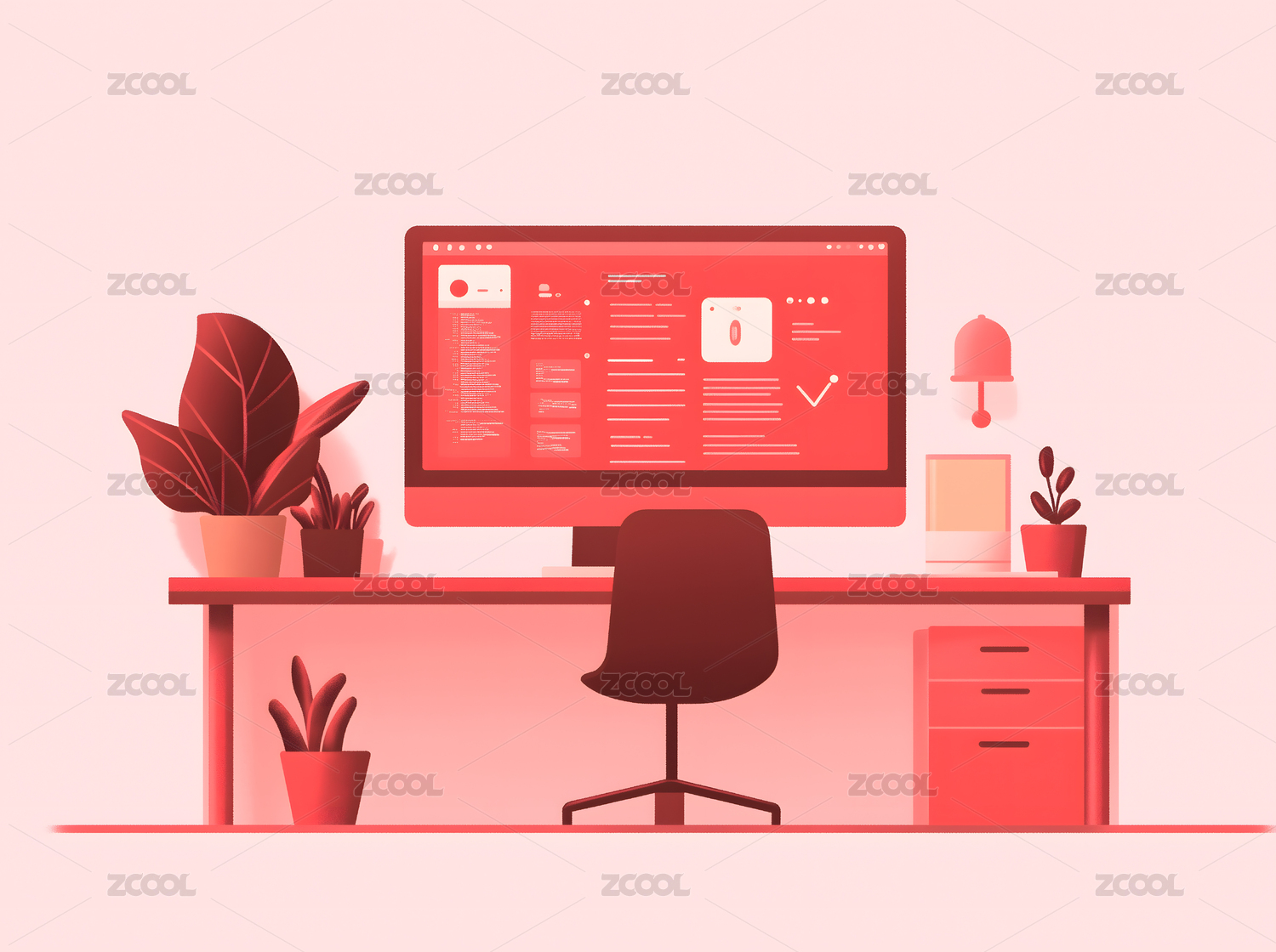 粉色背景下的办公室中的电脑插画