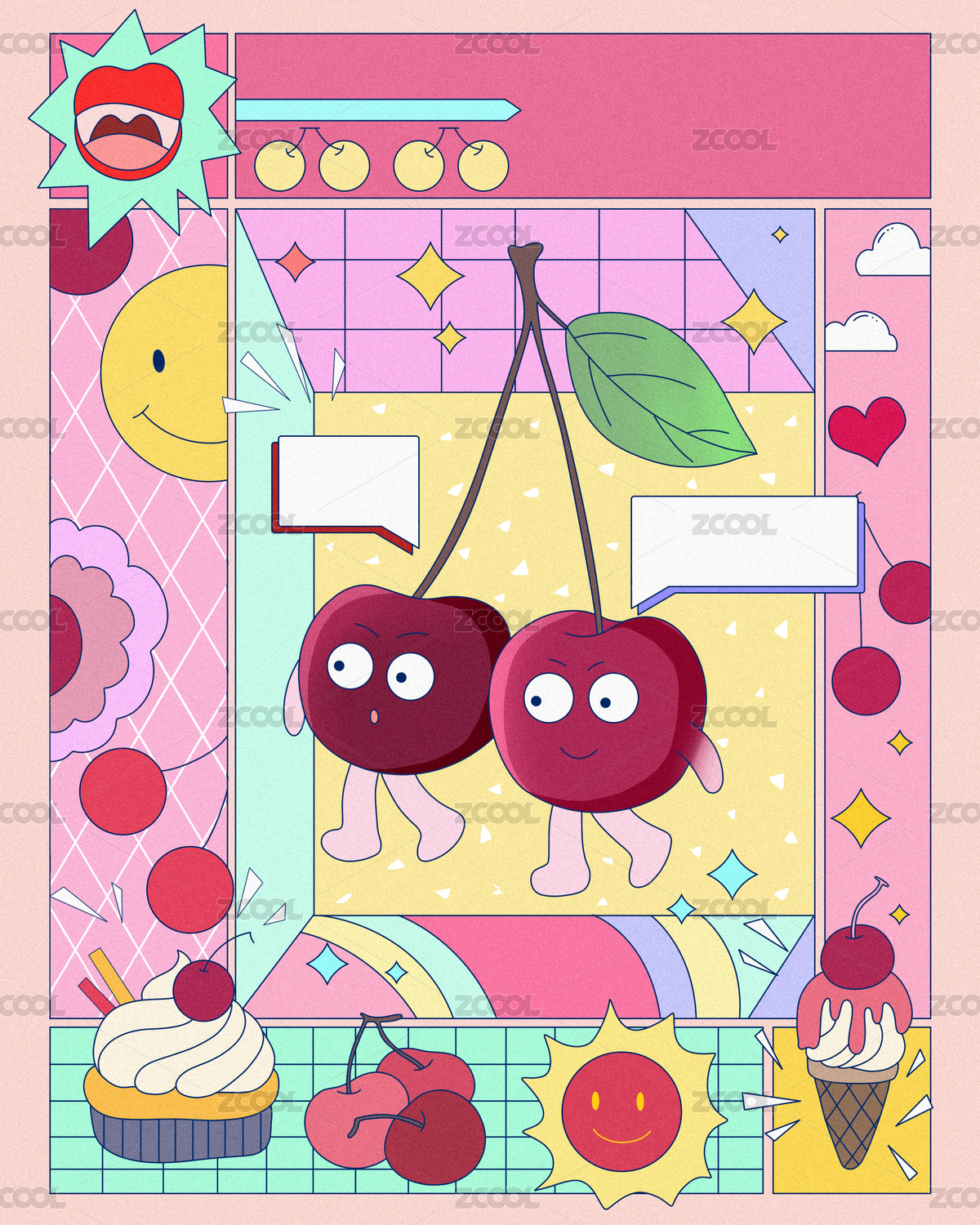 孟菲斯风水果樱桃拟人插画