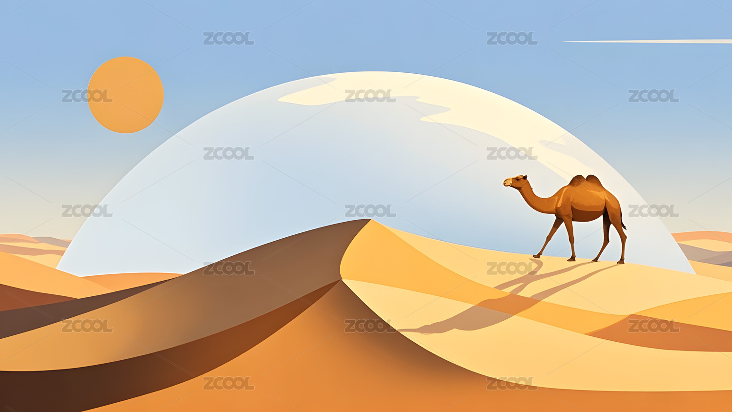 晴天明亮一匹沙漠中行走的单峰骆驼插画绘画