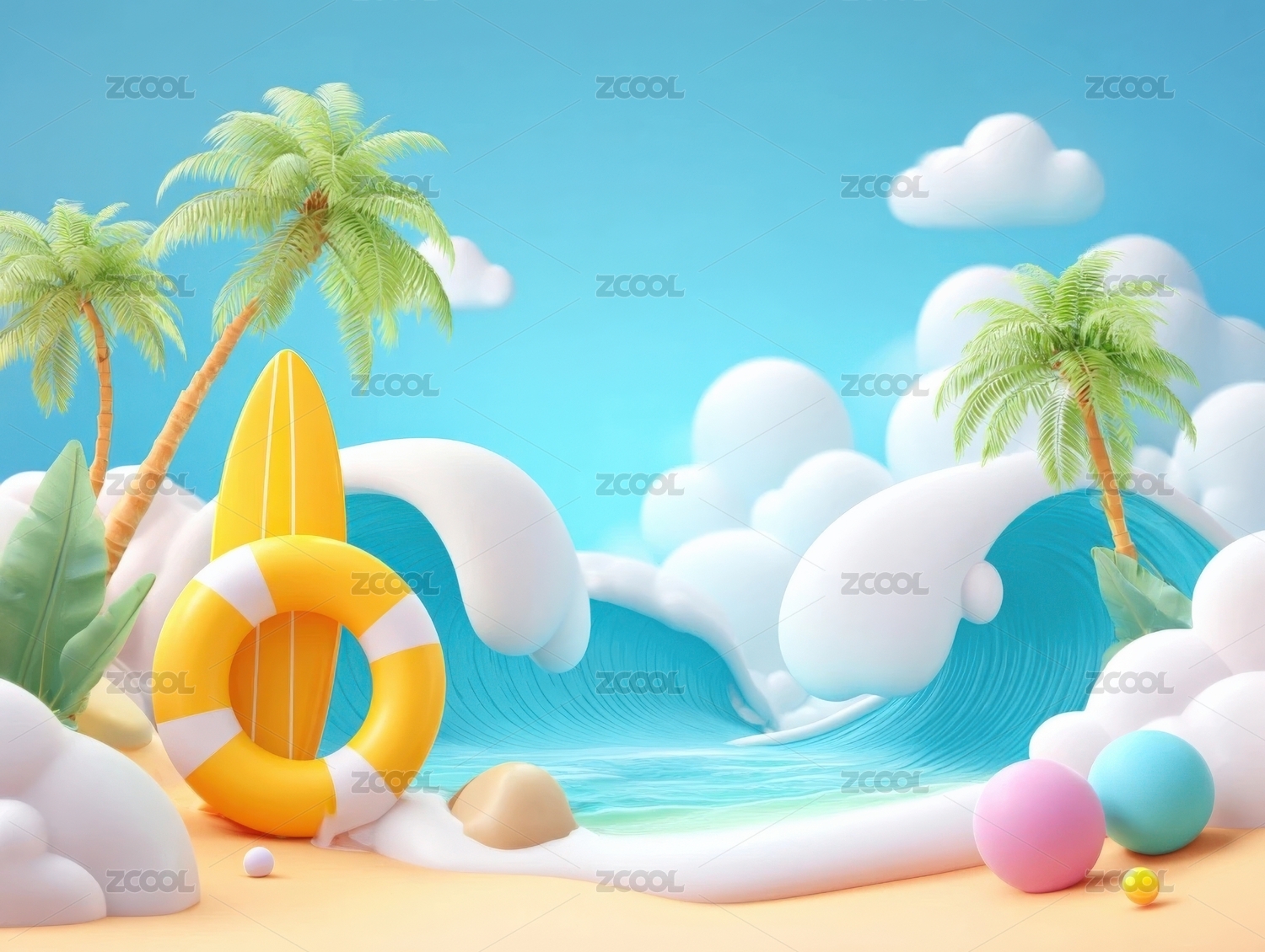 设计,场景,3D渲染,可爱,卡通,插画,氛围,云朵,彩色,夏天