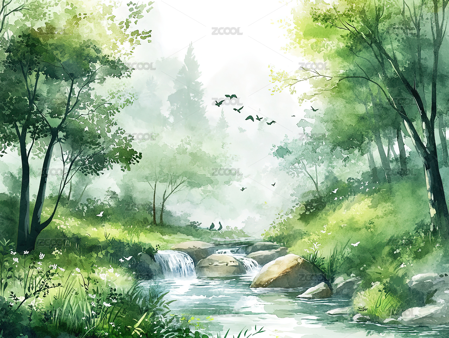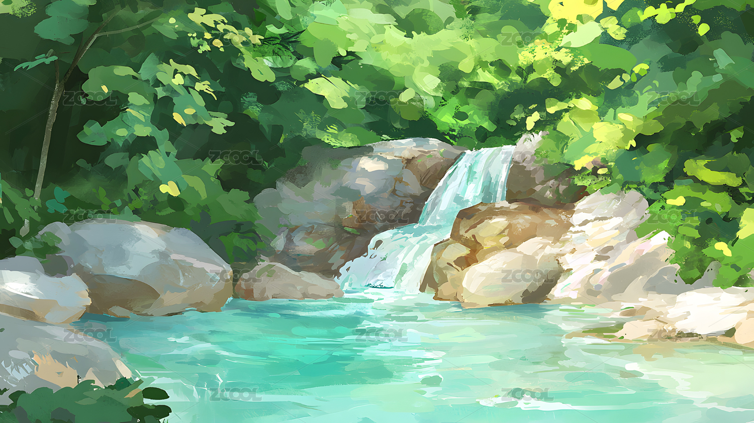 水彩溪流插画