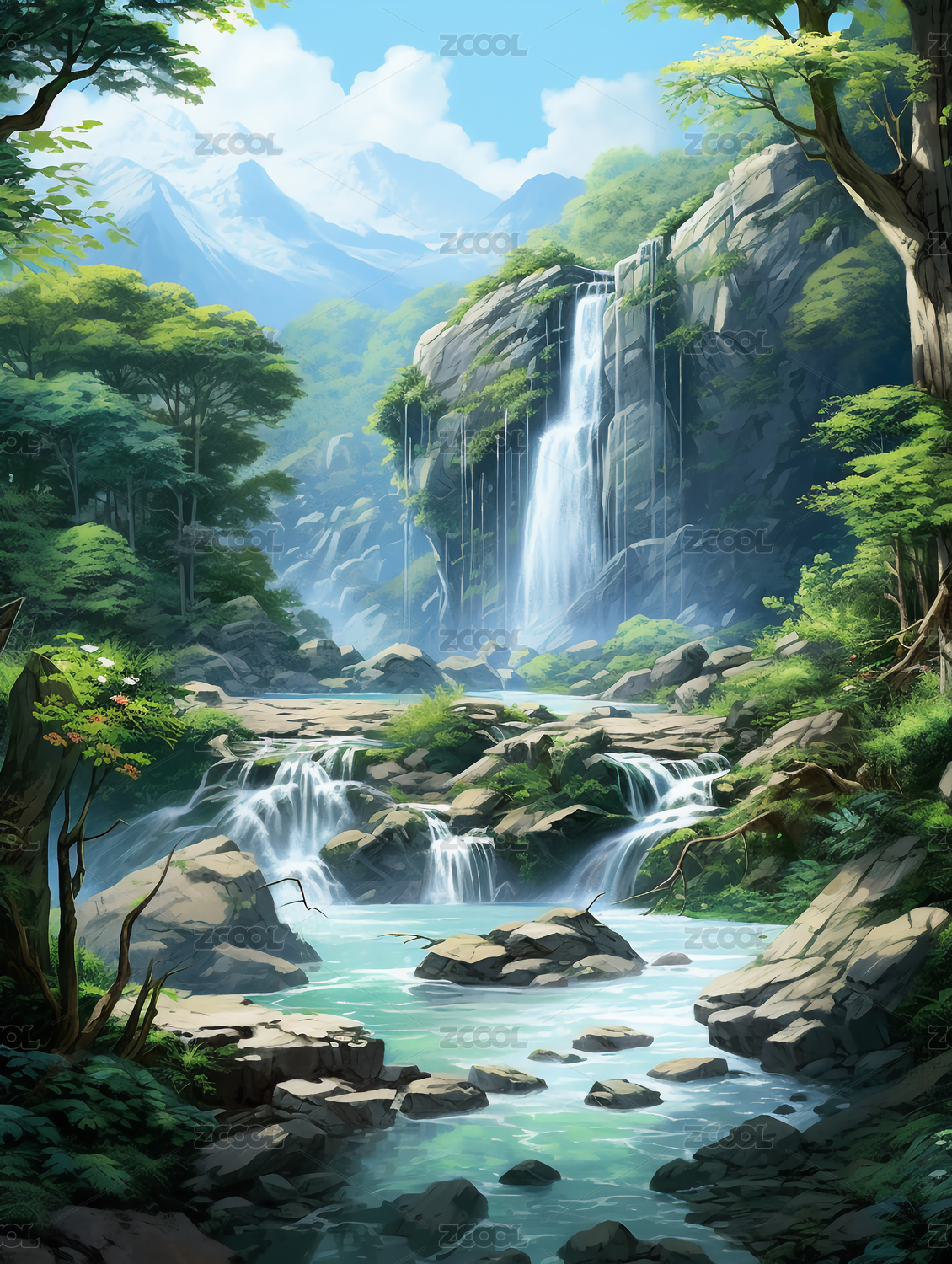 山水瀑布风景插画