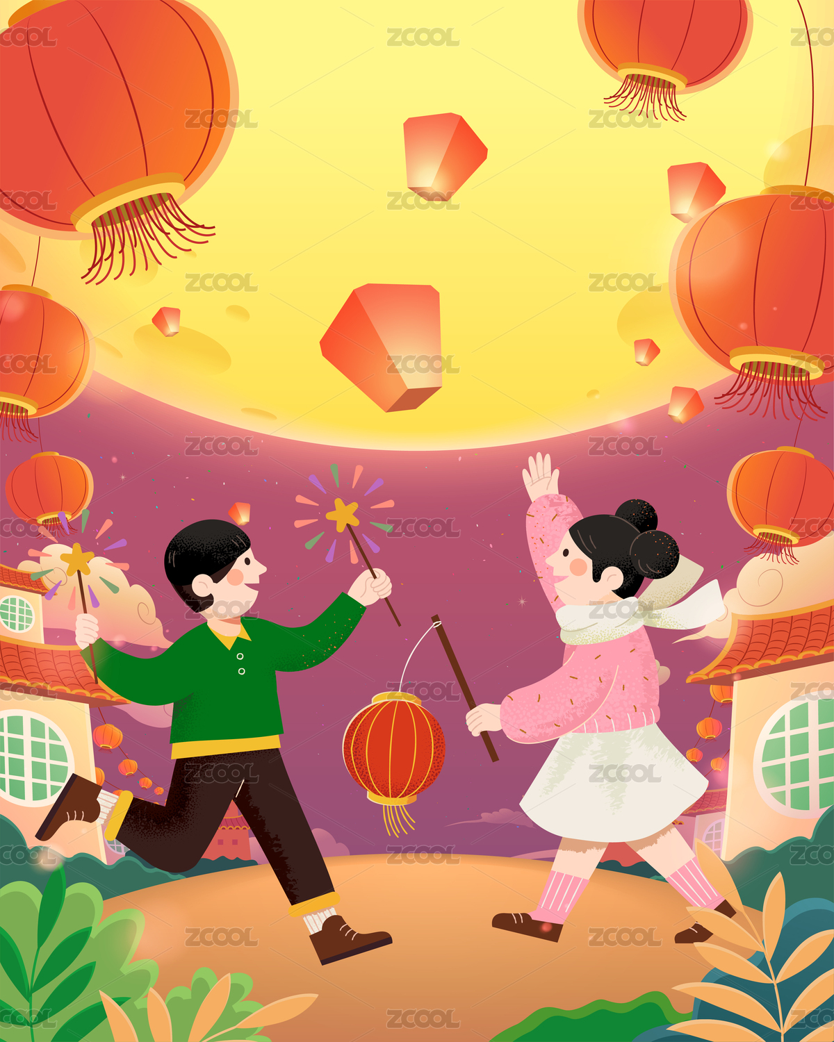 元宵节情侣夜晚赏灯猜灯谜赏月节日插画