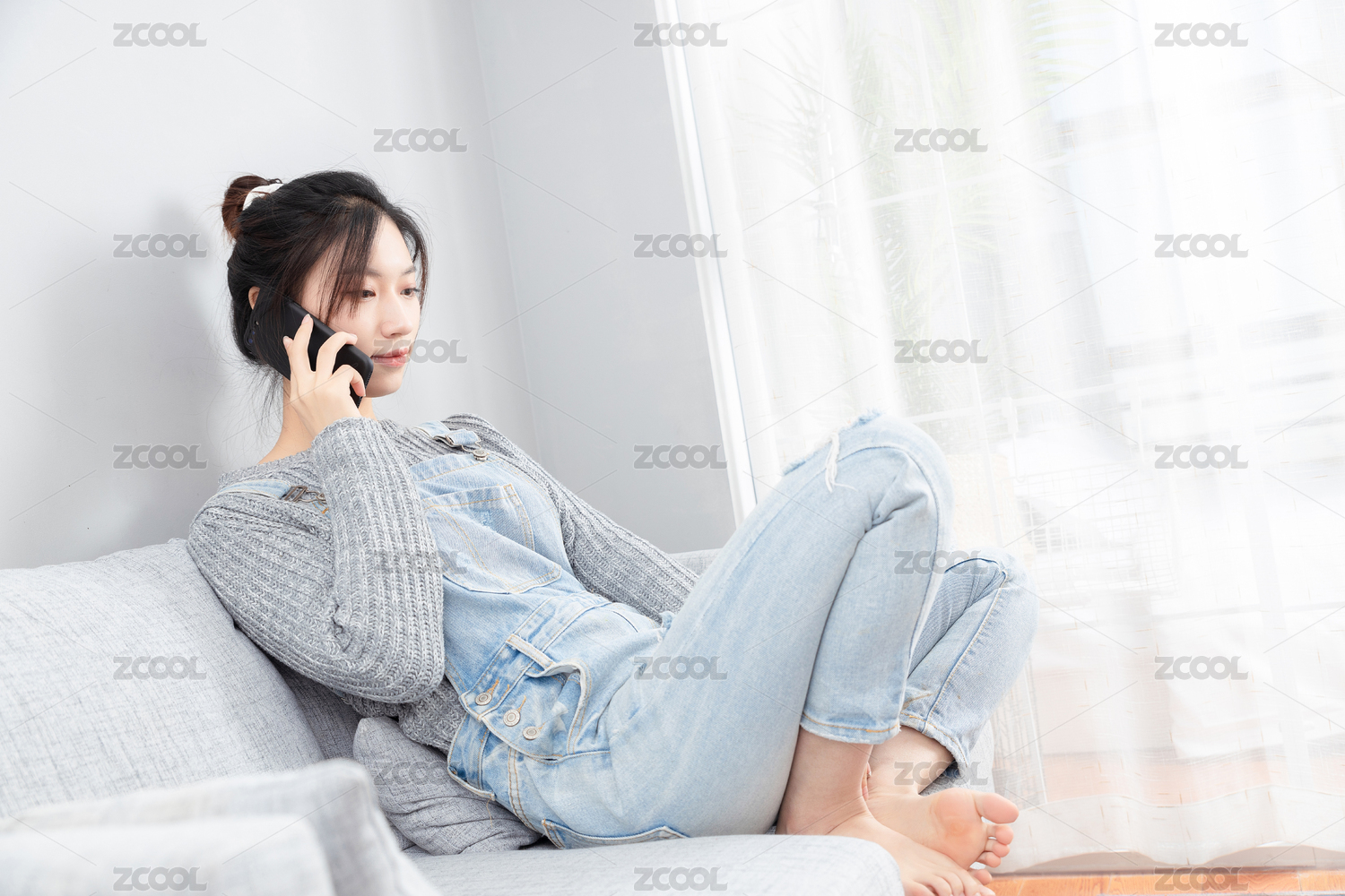 躺在沙发上正在玩手机的亚洲女孩