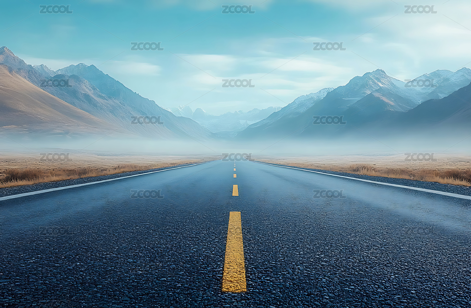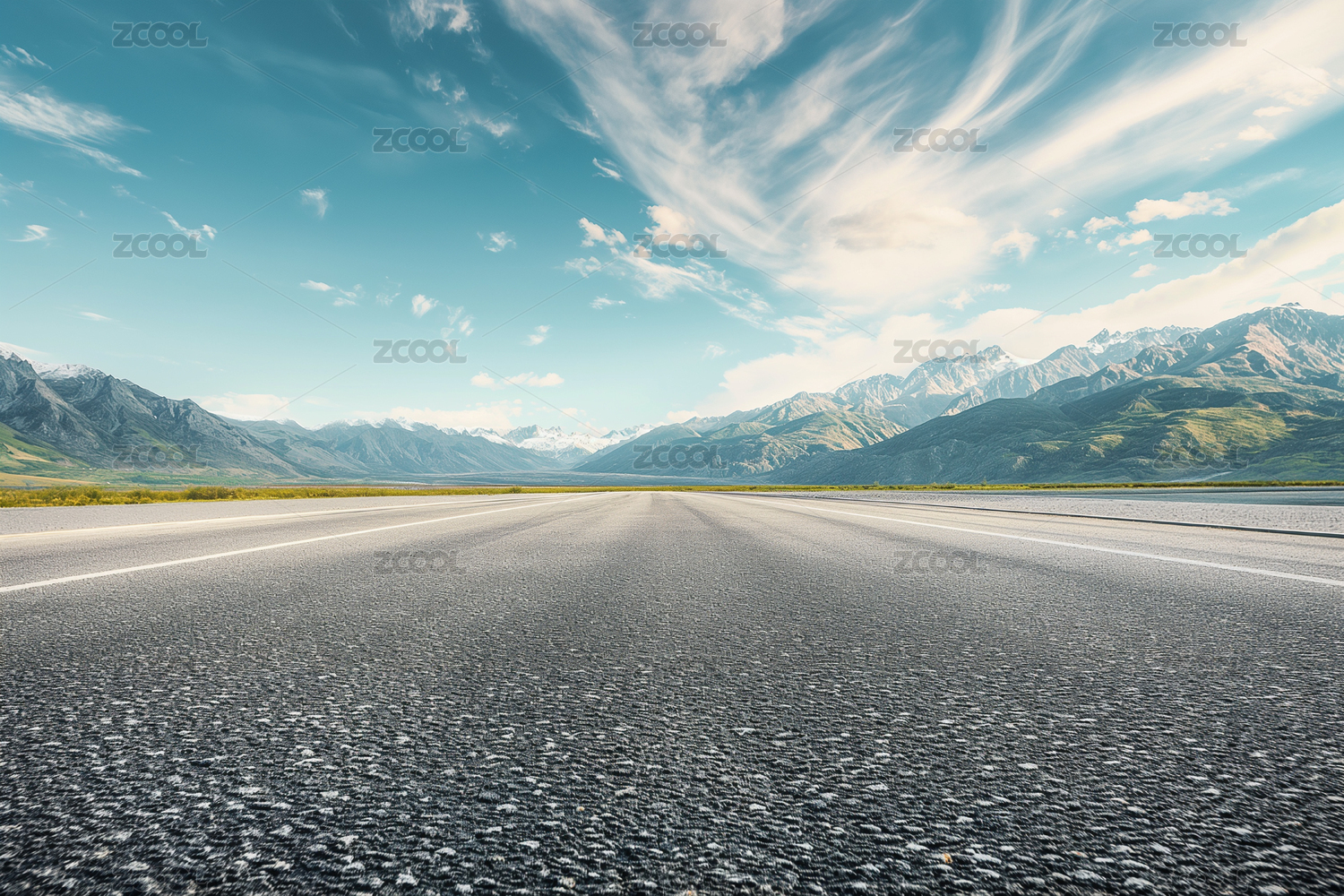蓝天下无人的沥青路面与远处连绵起伏的山脉