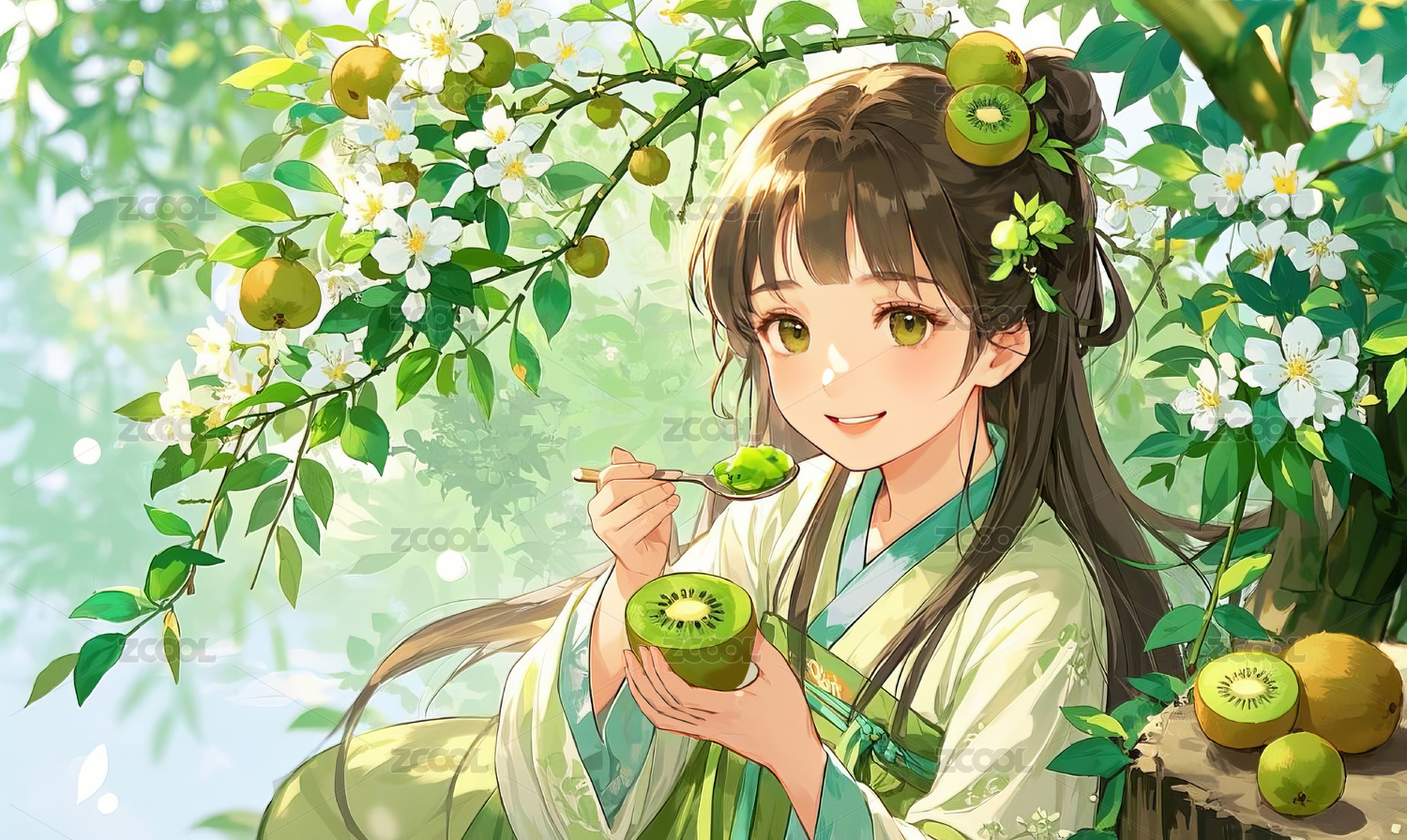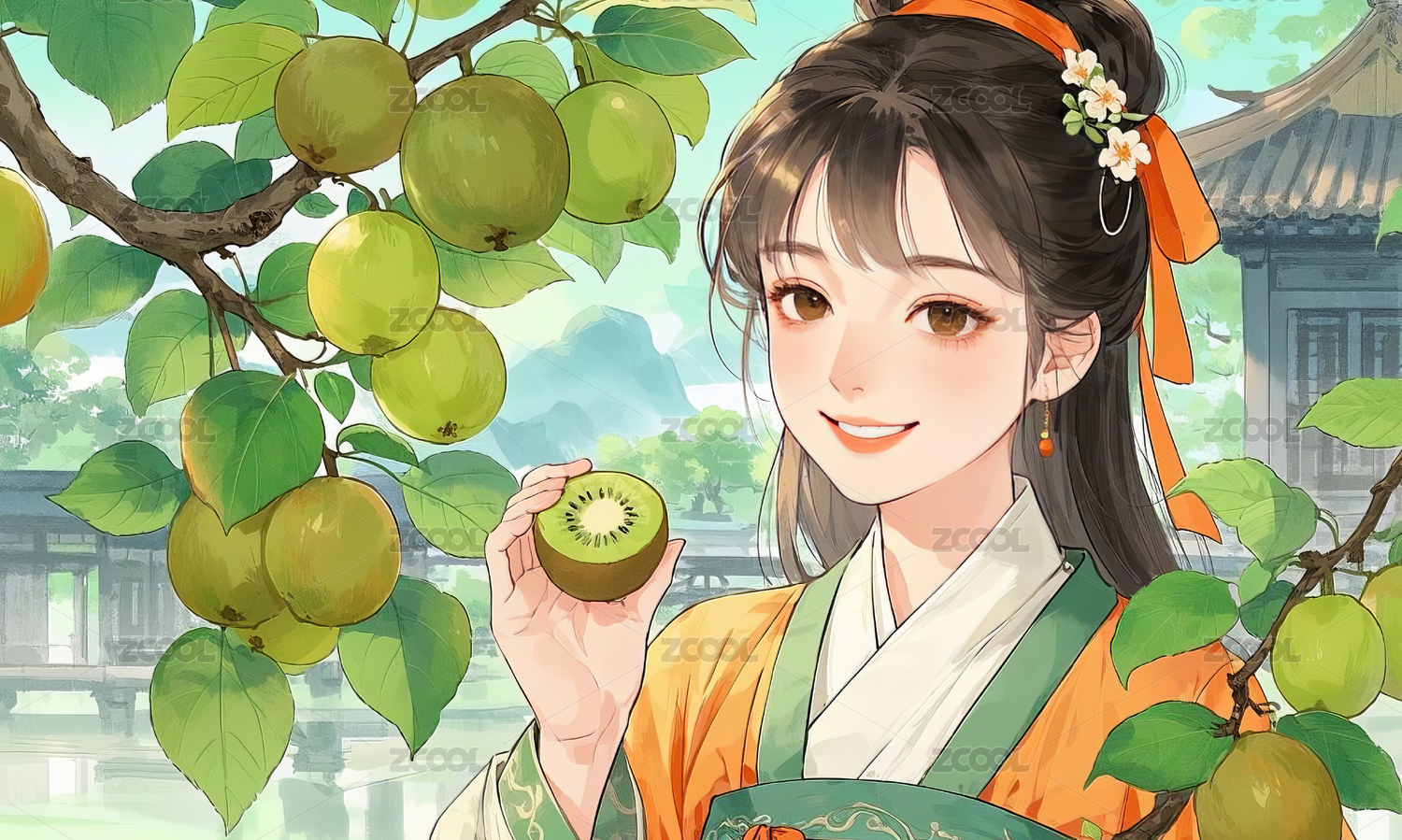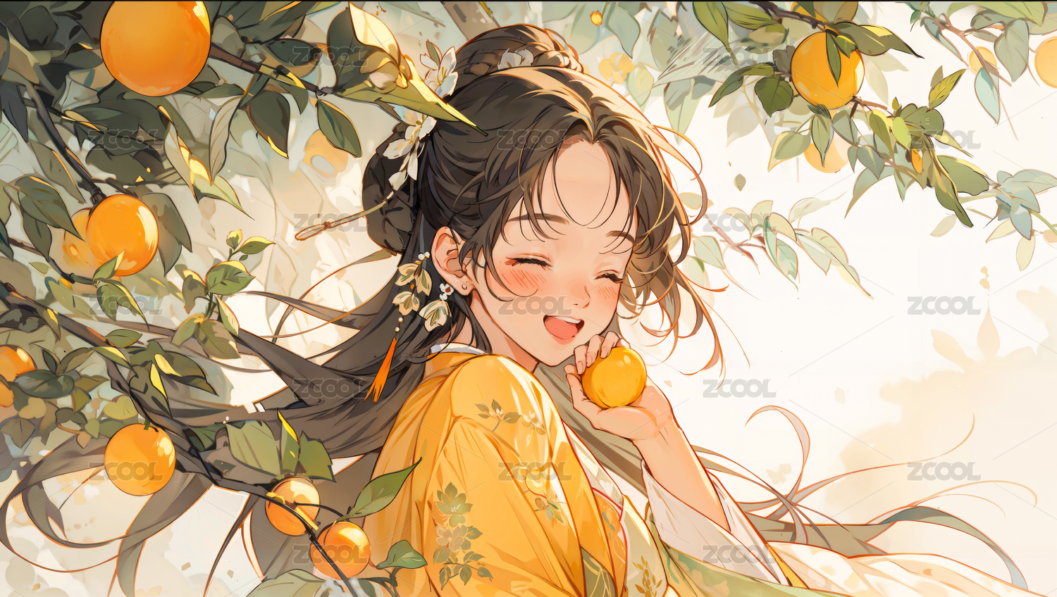 秋天桔子树下可爱的汉服女孩品尝桔子