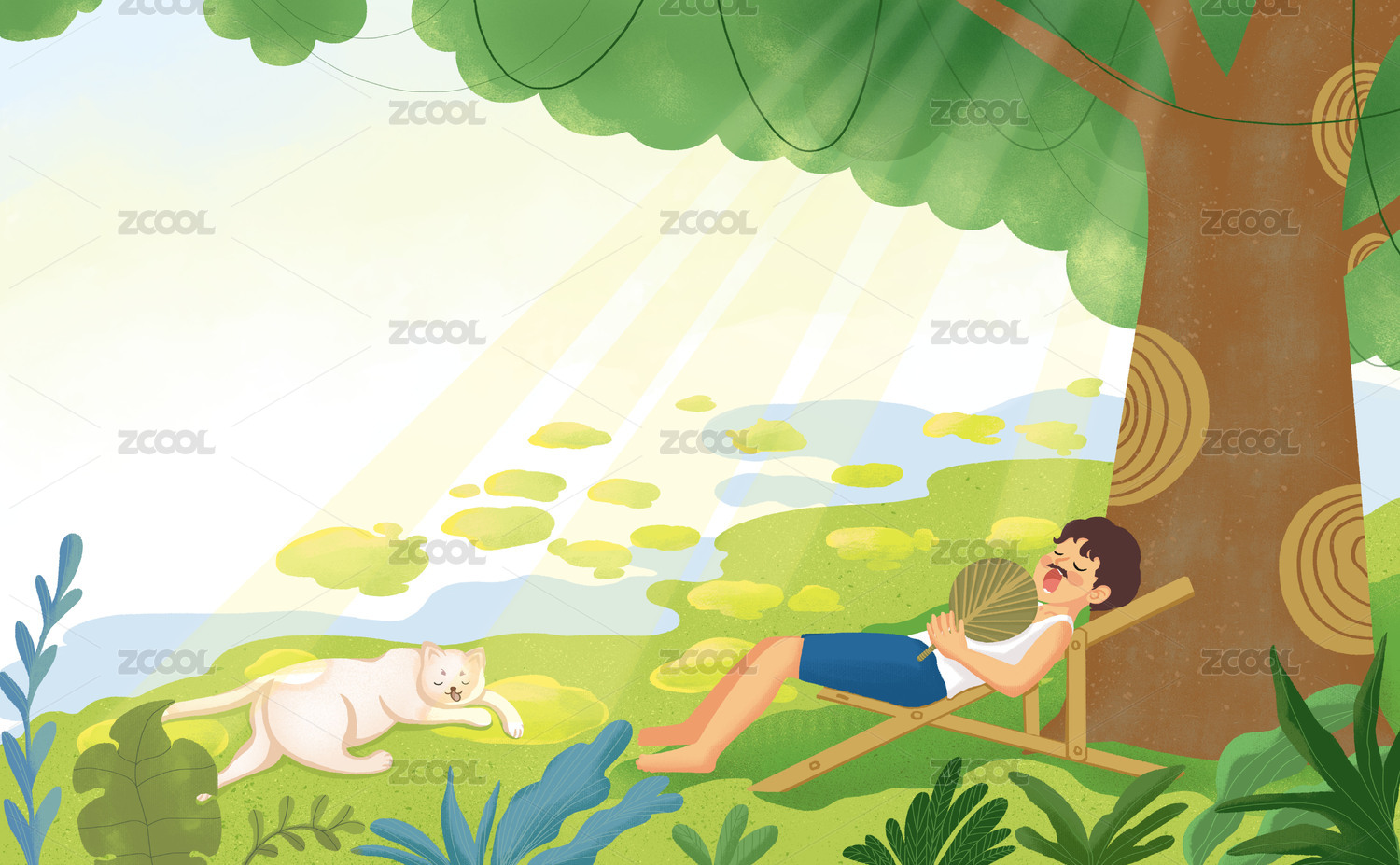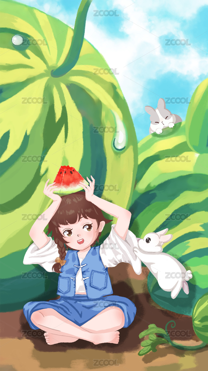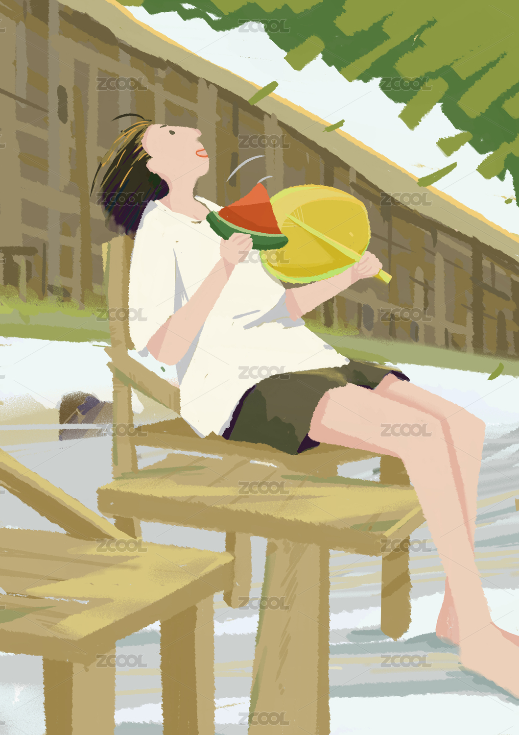 夏季树荫坐在门口吃西瓜清新手绘插画
