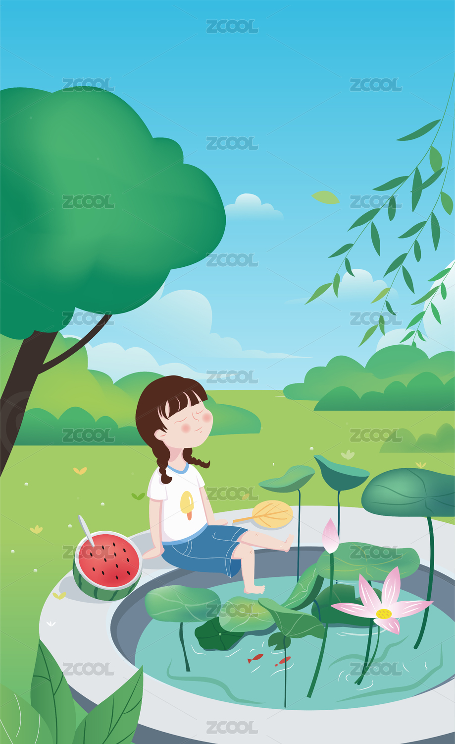 夏日池塘边坐着闭眼享受夏天的双马尾女孩