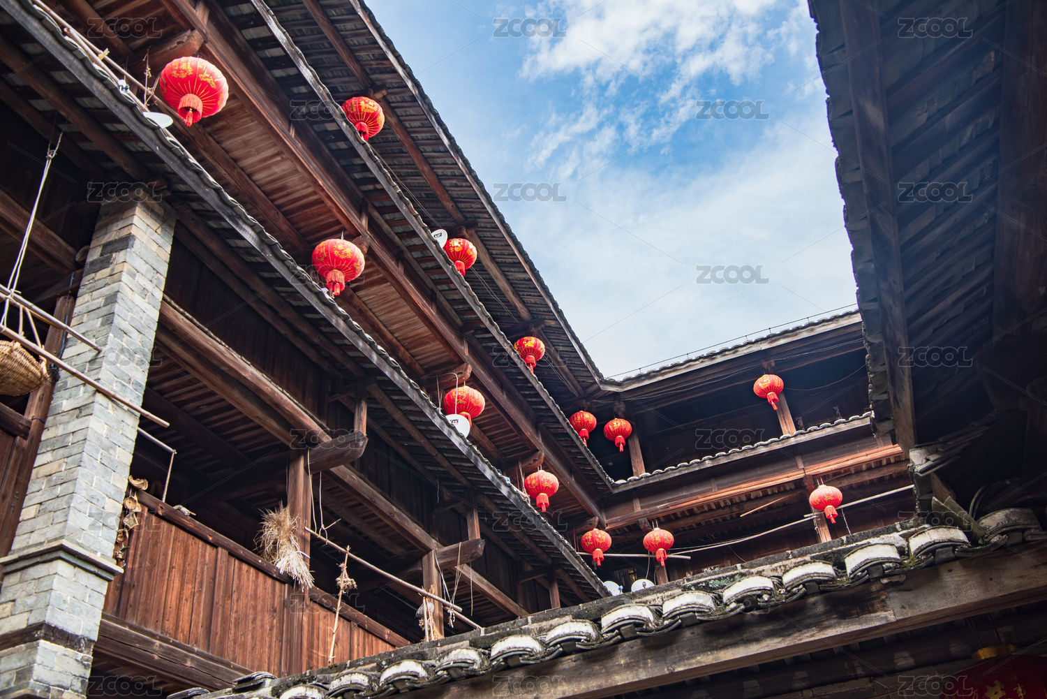 古建筑木楼前悬挂着一串串红灯笼
