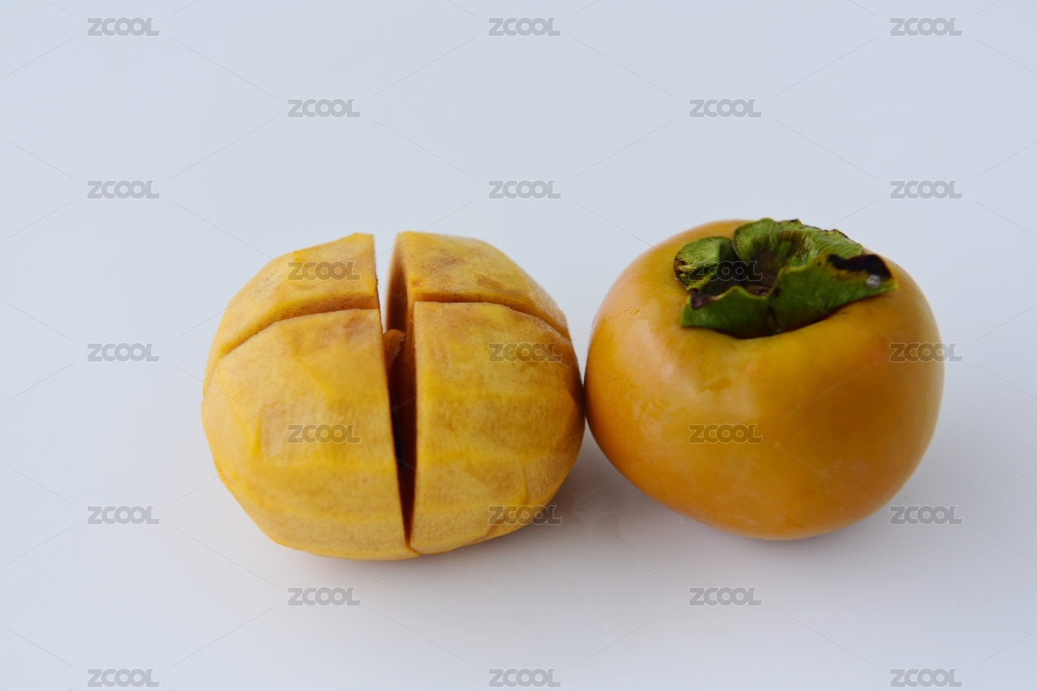 白色背景中一个柿子和半个切开的柿子