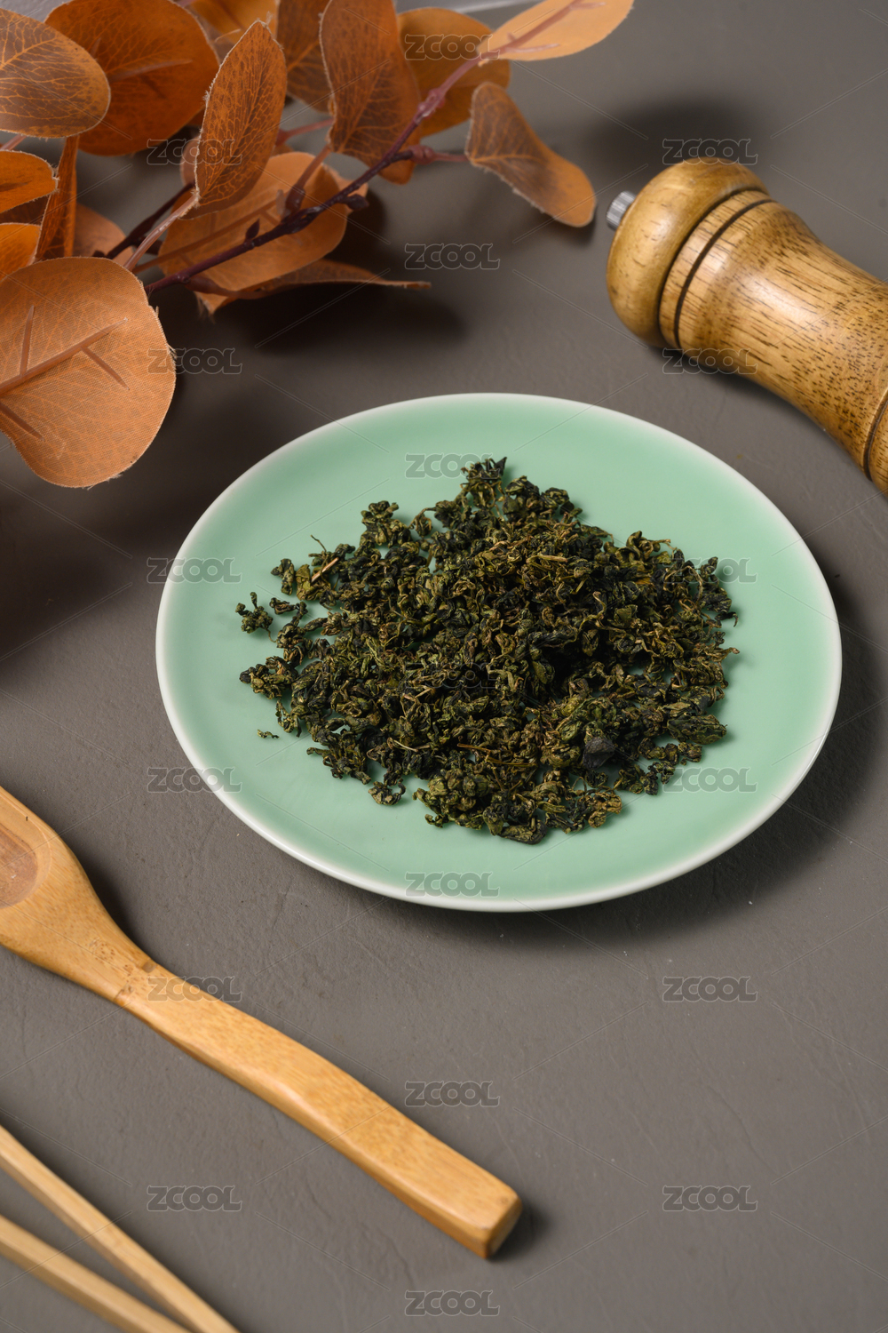 桌面上的盘子里的干爽清香的高山绿茶