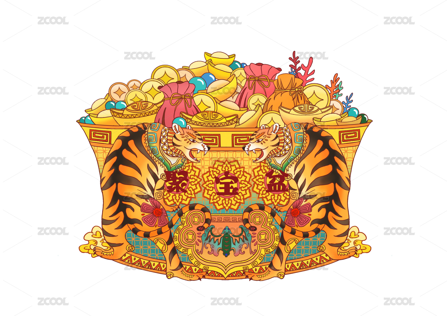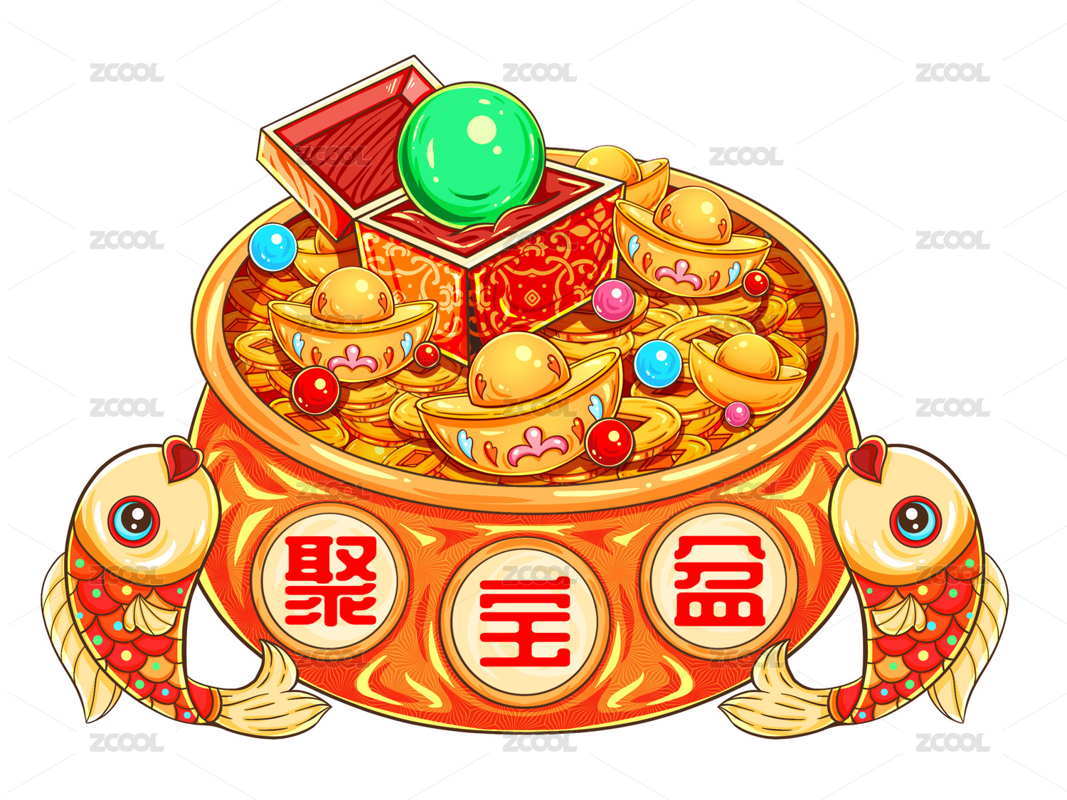 插画,红色,吉祥物,元宝,珍珠,聚宝盆,金银,钱,国潮风