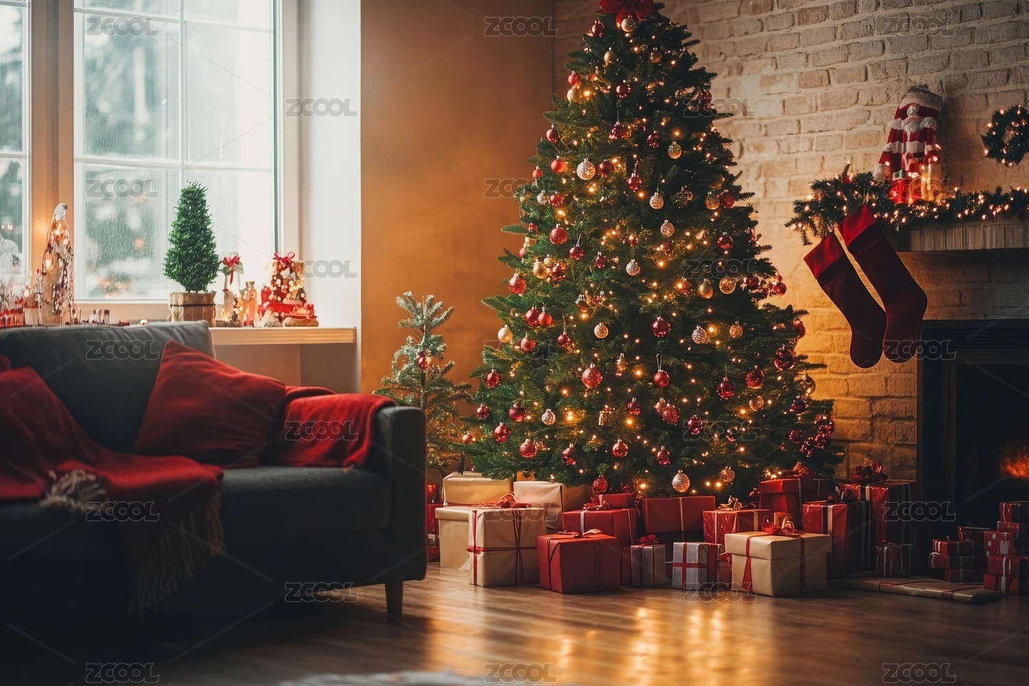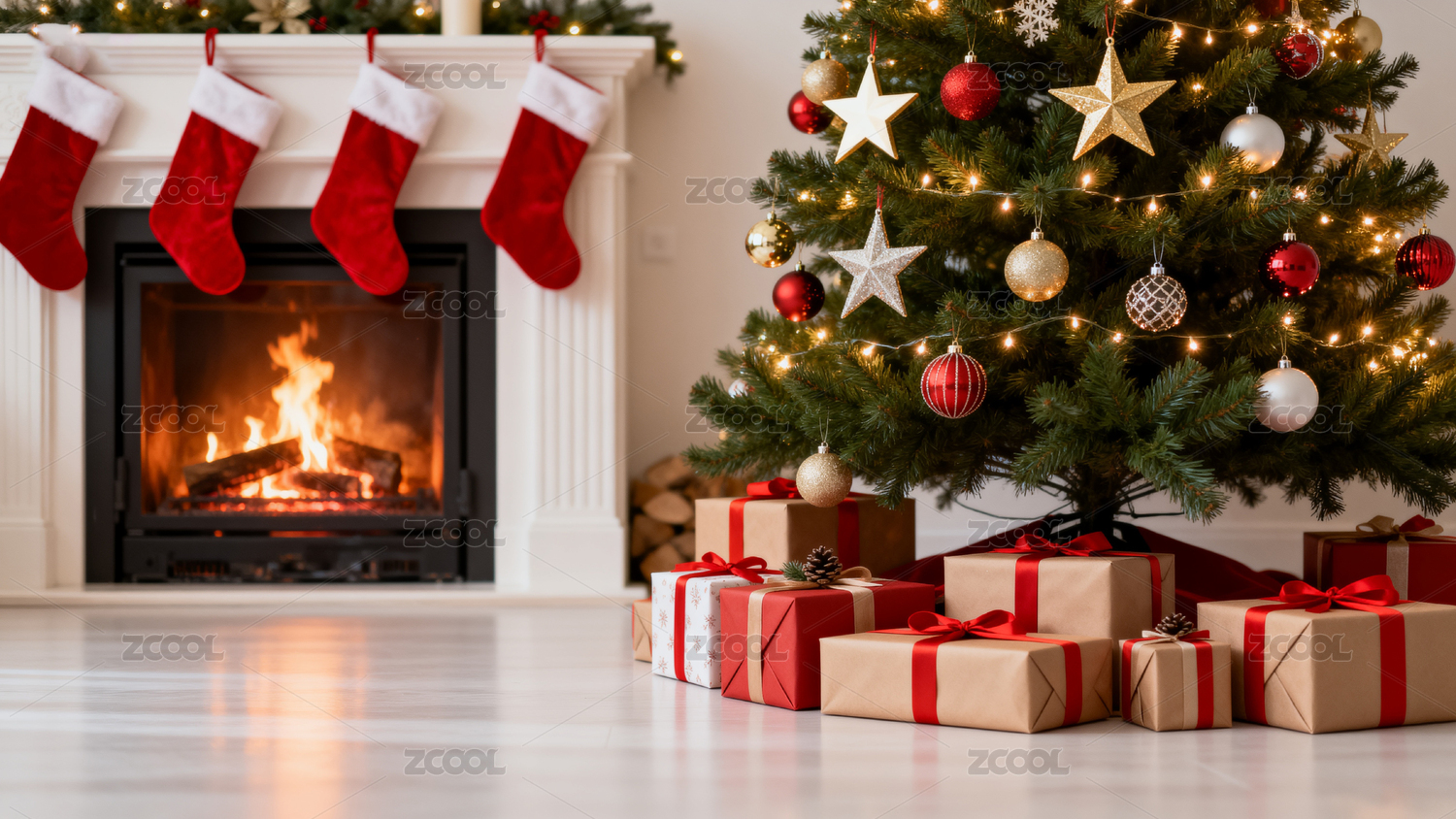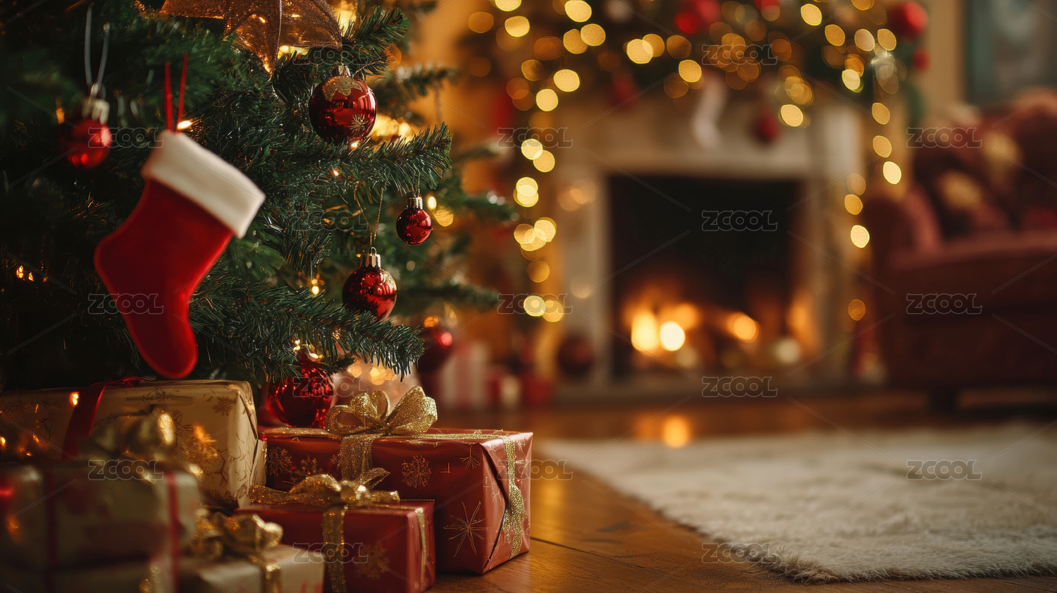 圣诞节室内圣诞树礼盒和燃烧的壁炉