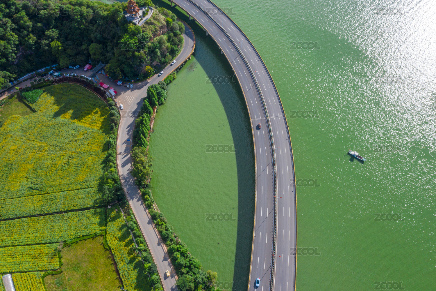 夏季白天正上方视角航拍徐州云龙湖湖上公路
