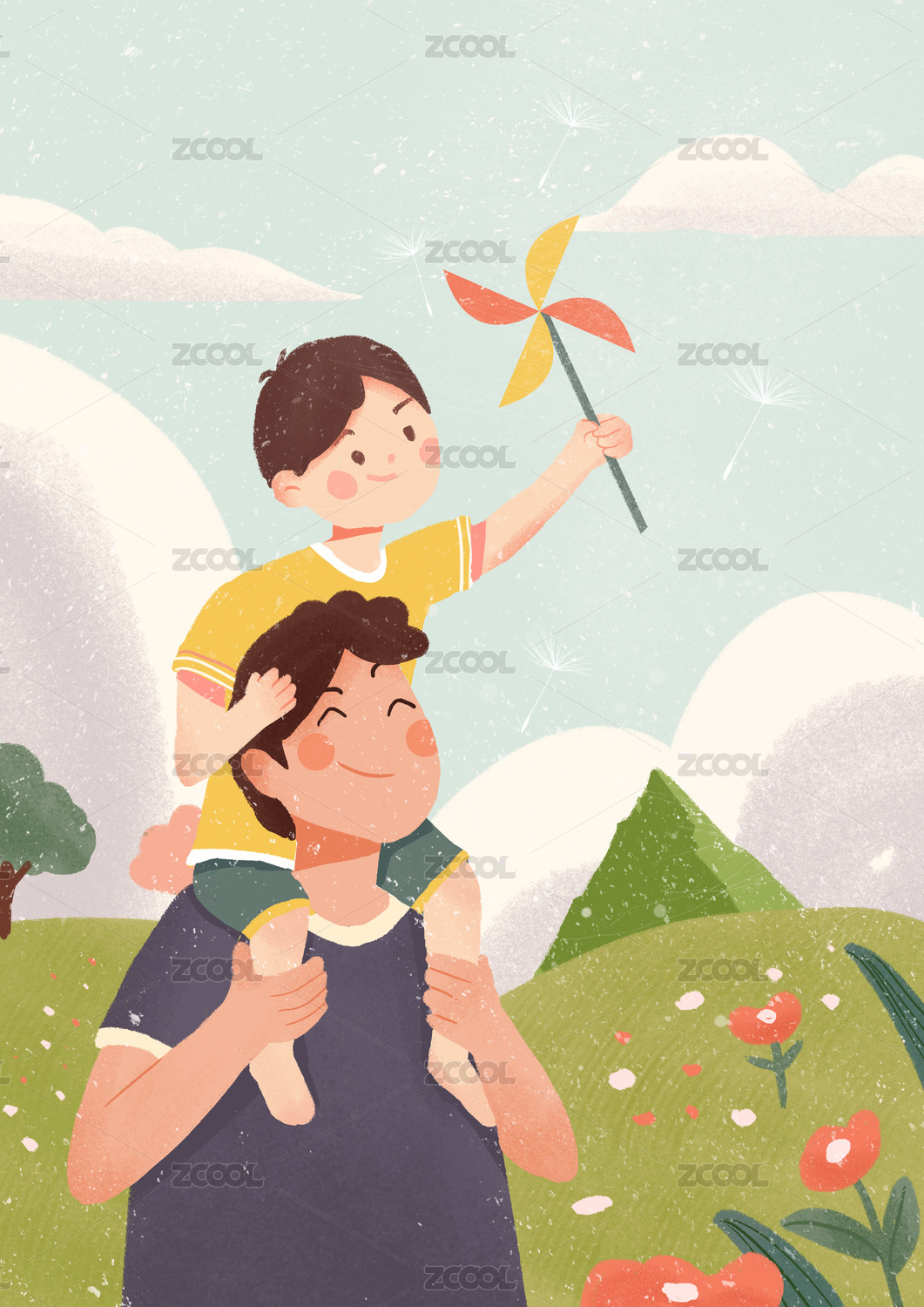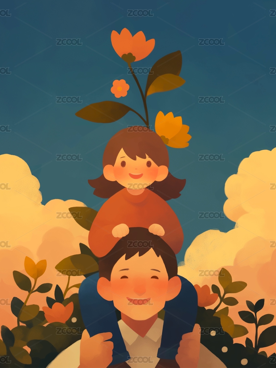 父亲节 花丛中小女孩坐在爸爸肩膀上 温馨手绘插画竖版