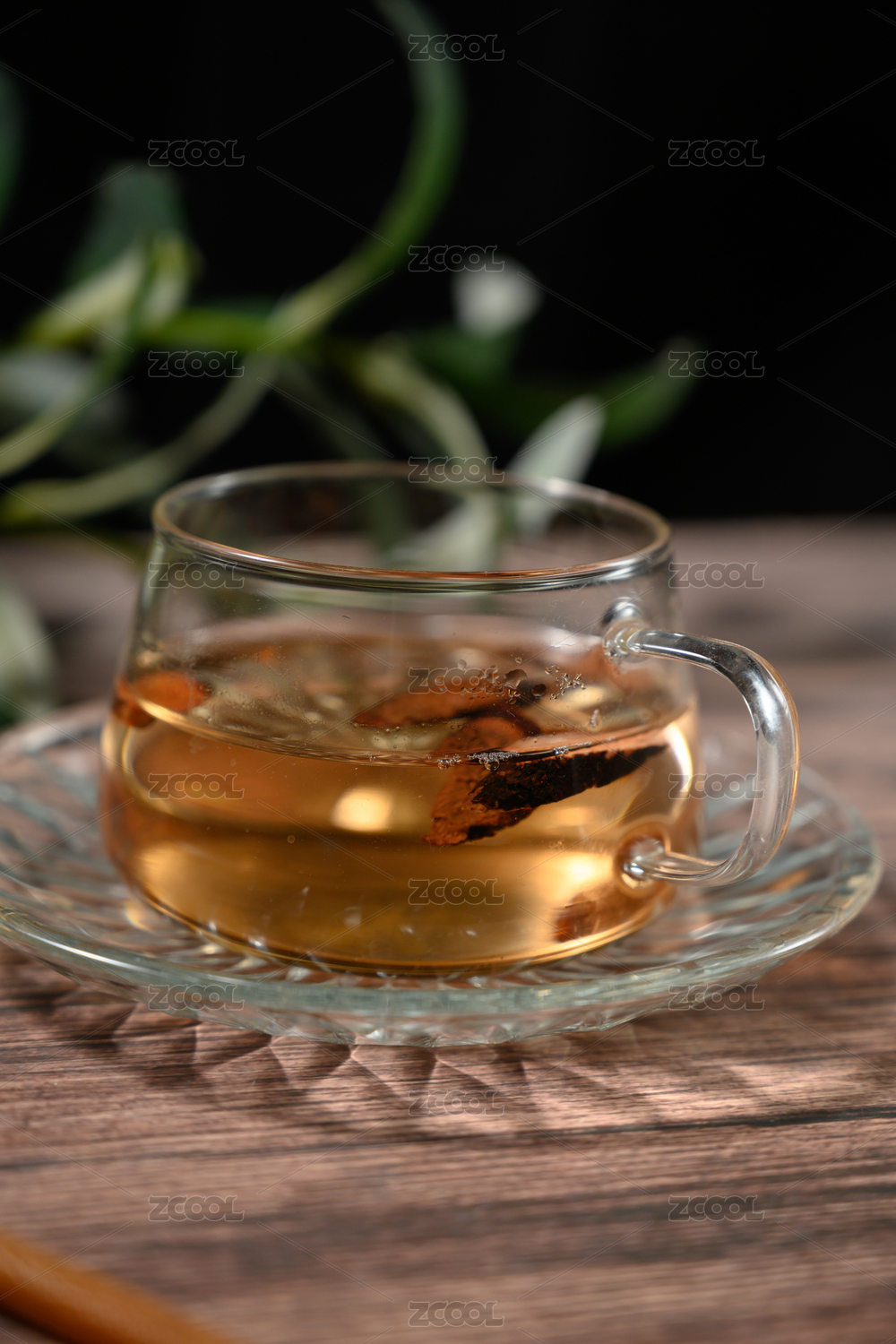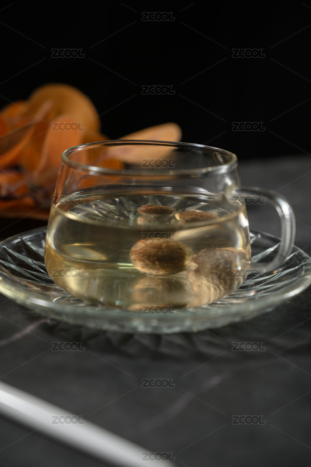 桌面上的杯子里的甘甜可口的陈皮白茶