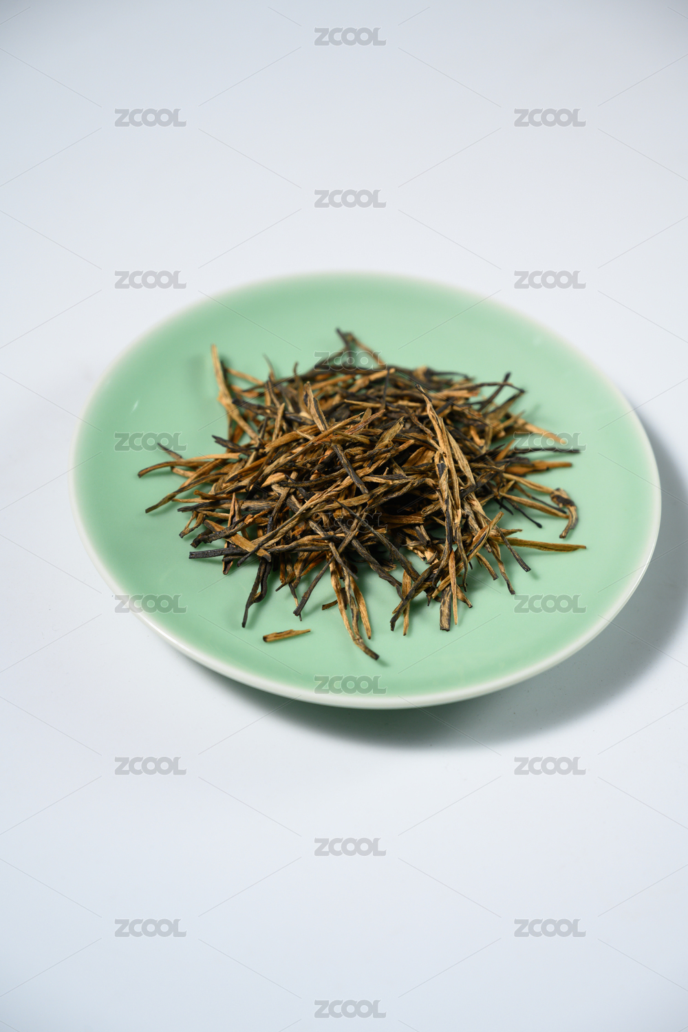 桌面上的盘子里的干爽切香气四溢的滇红金针
