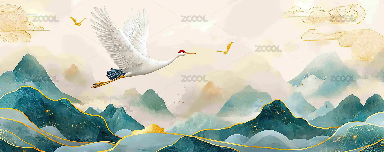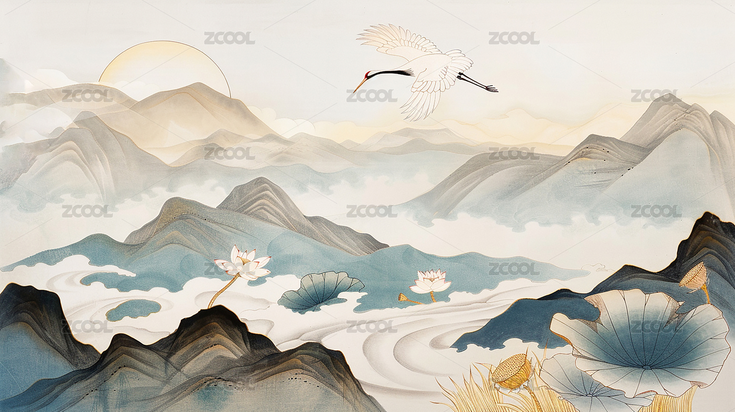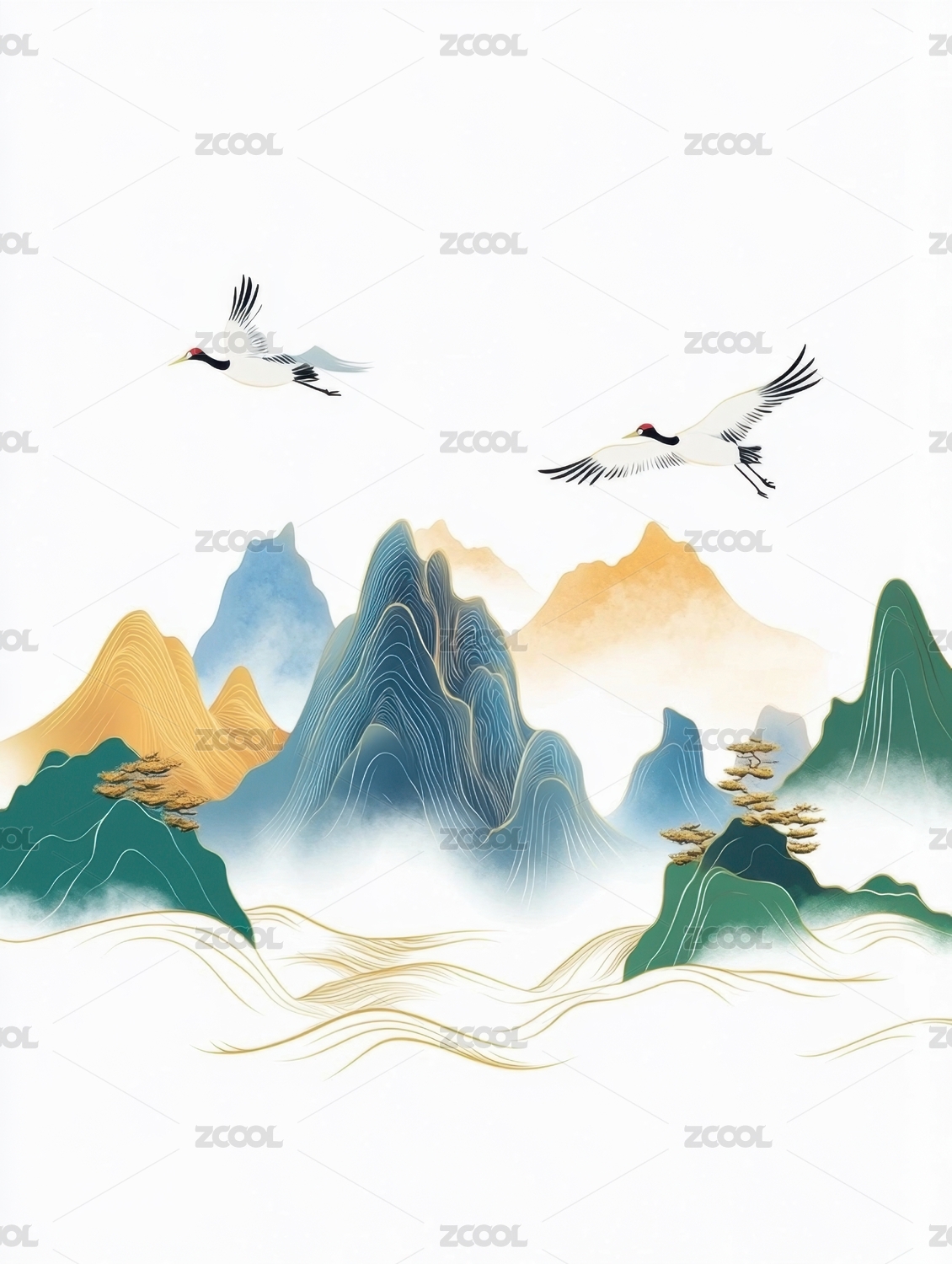 插画,水墨画,装饰画,新中式风格,山水画,山脉,水平画幅,风景,壁纸,山水