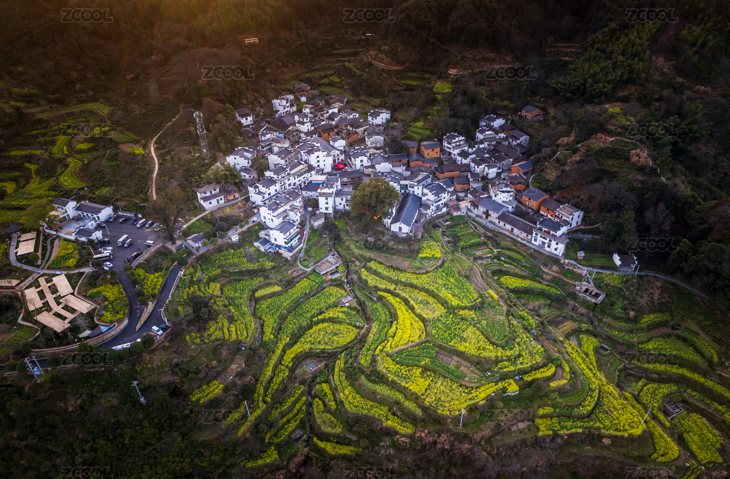 中国江西省婺源县岭脚村油菜花梯田航拍