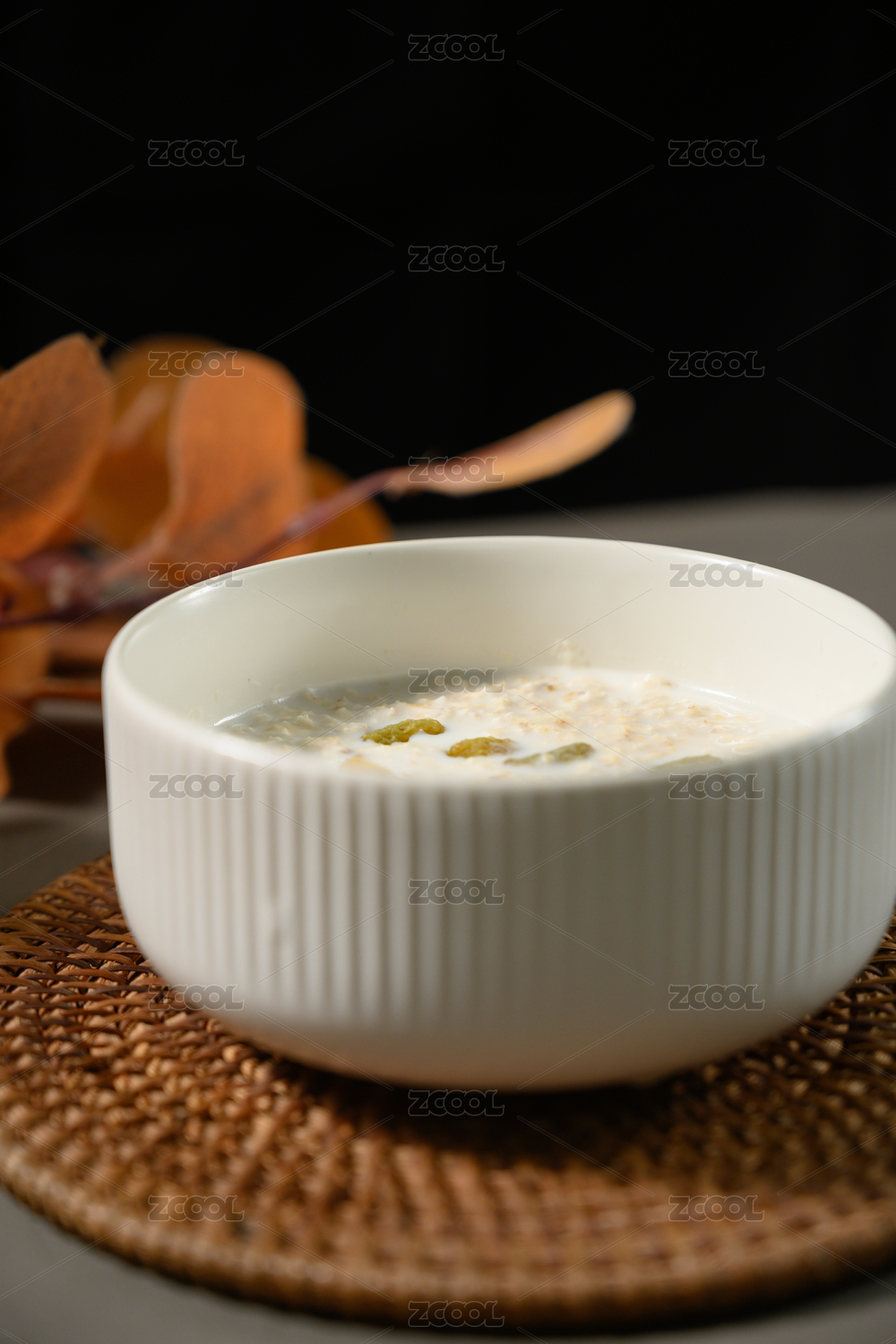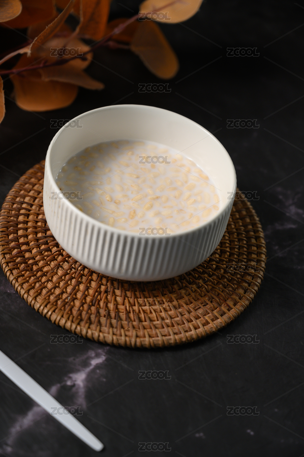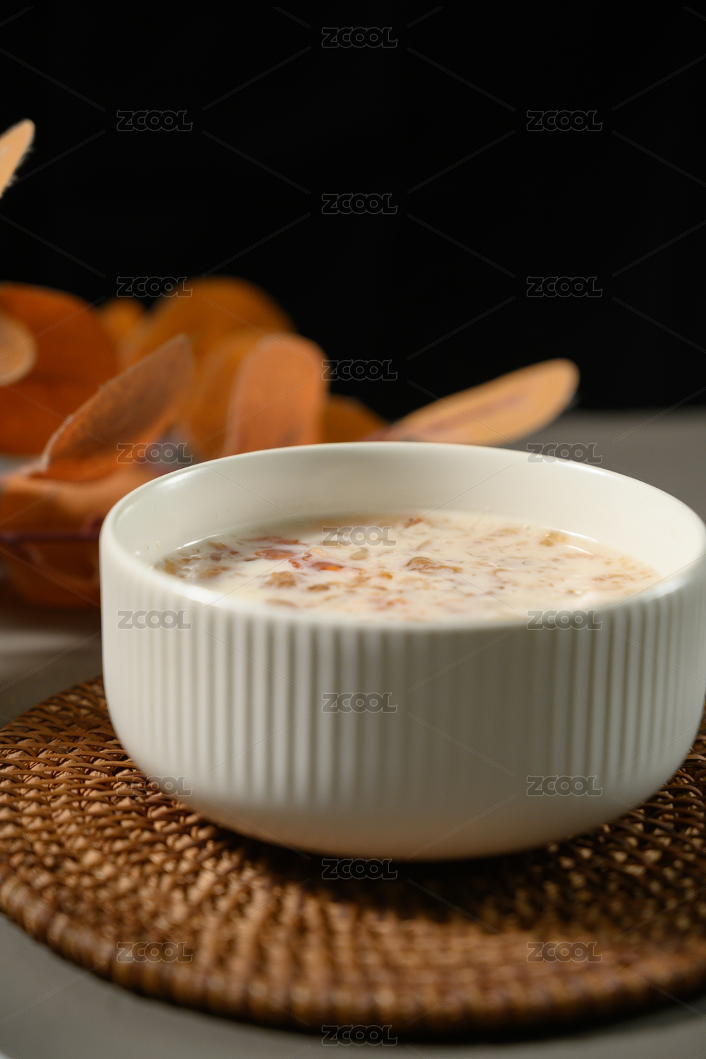 桌面上的碗里的美味可口的牛奶炖桃胶