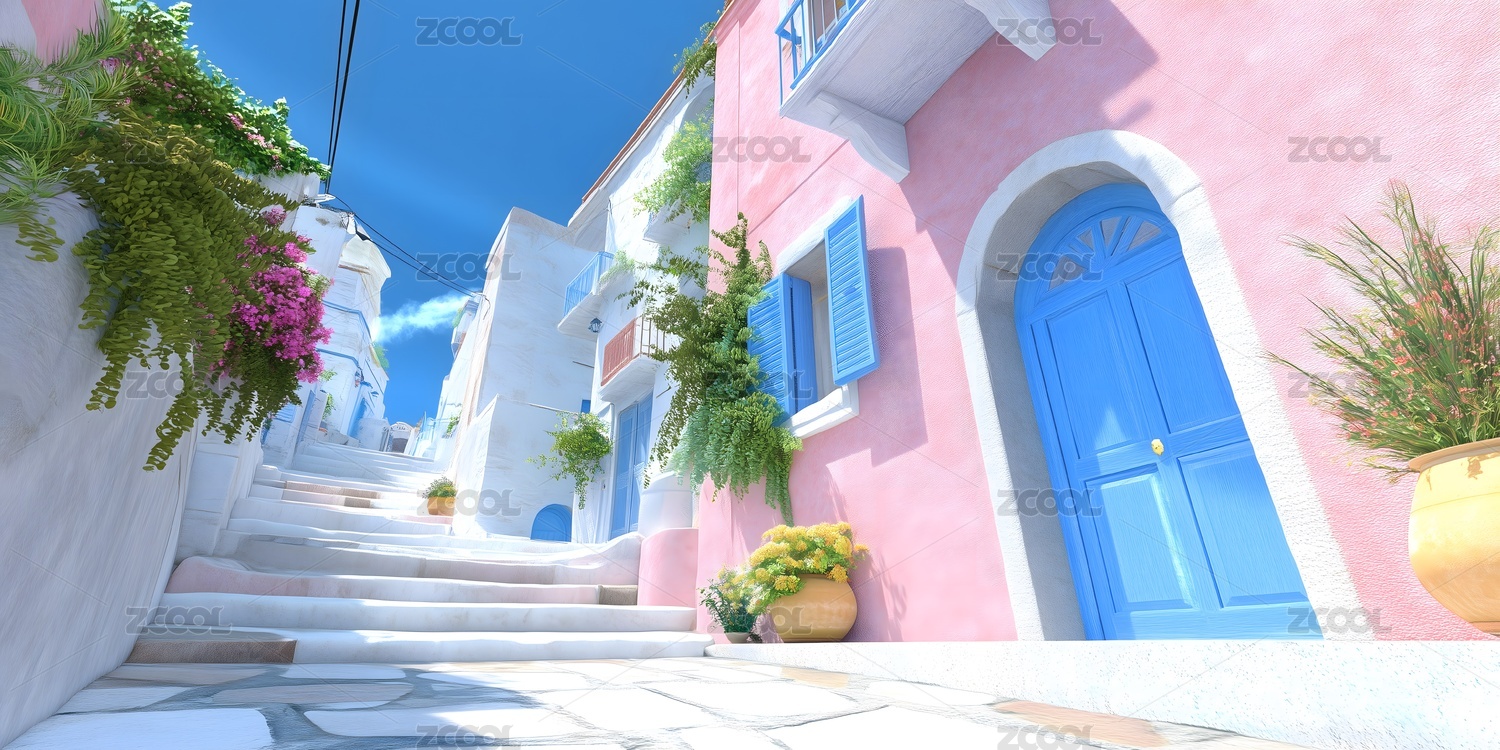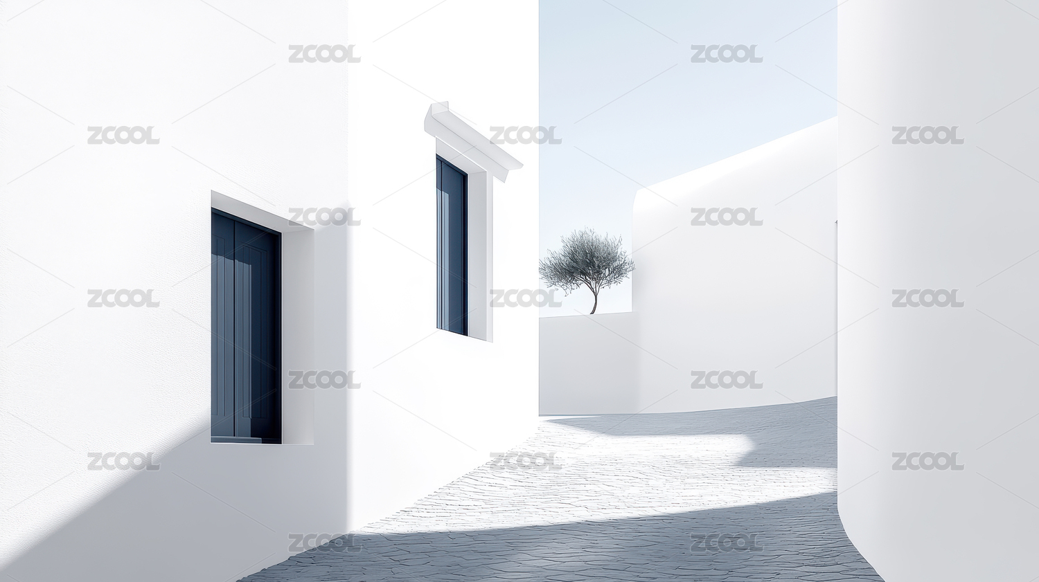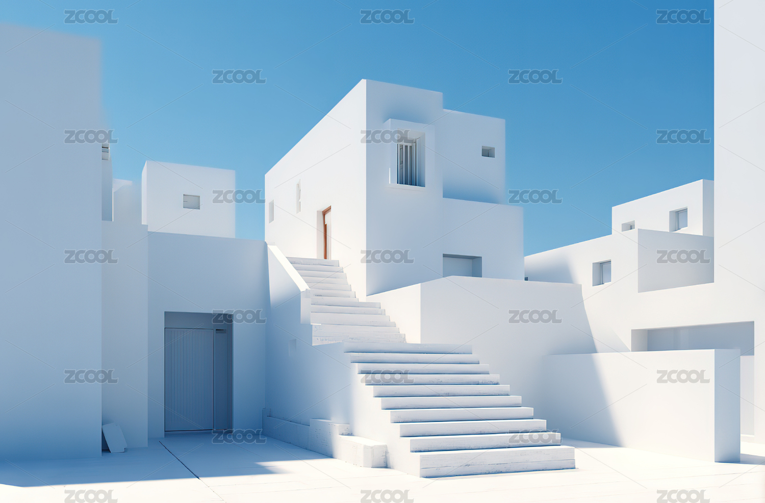 希腊圣托里尼岛的白色建筑与蓝色天空