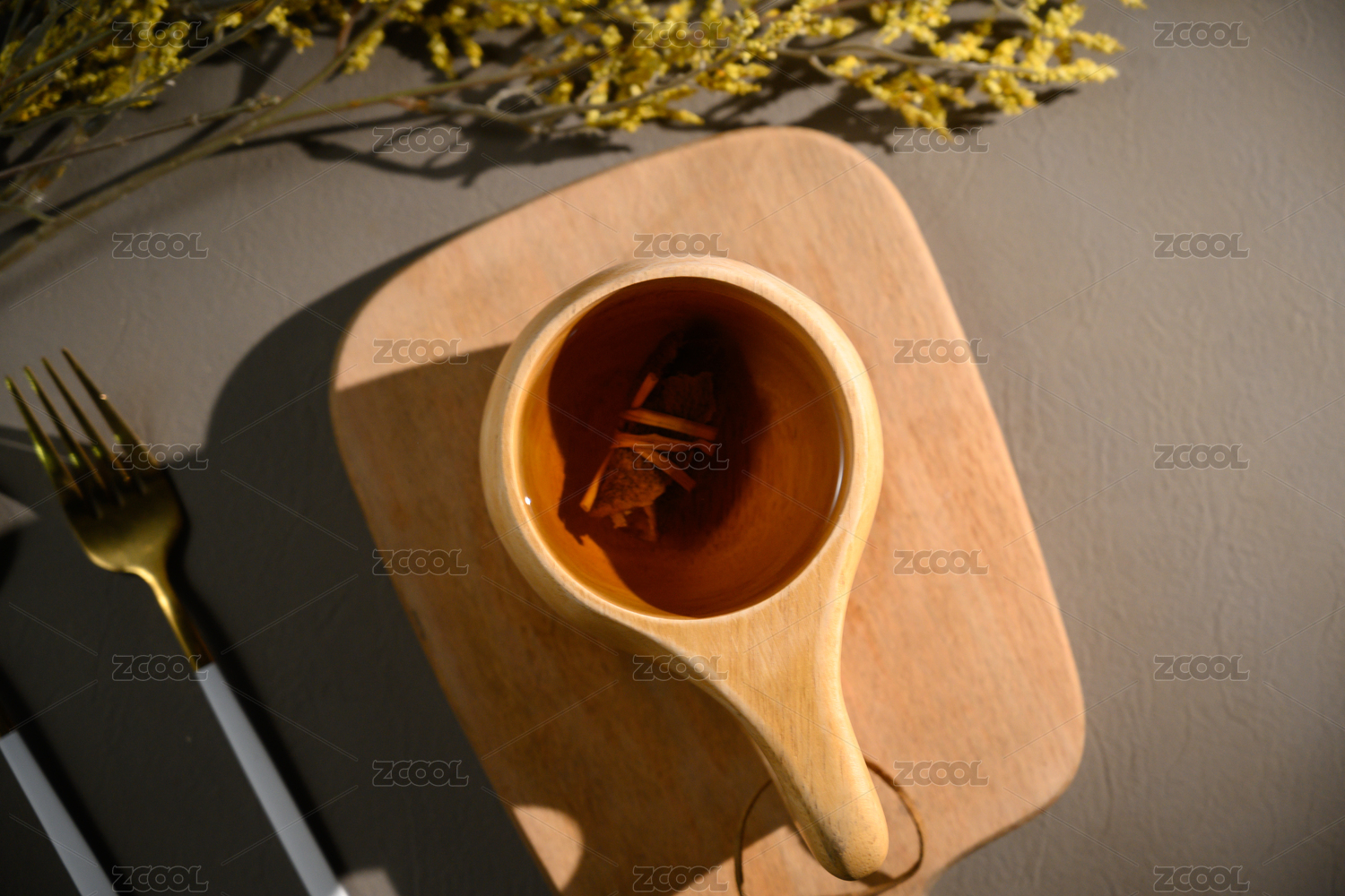 桌面上的盘子里的美味可口的咖啡果皮茶