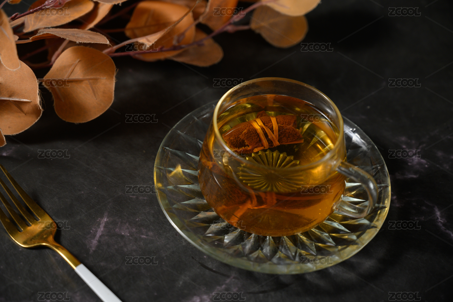桌面上的杯子里的甘甜可口的陈皮白茶