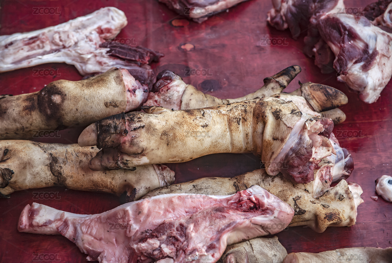 中国农村大集市场上被火烤退毛的猪蹄