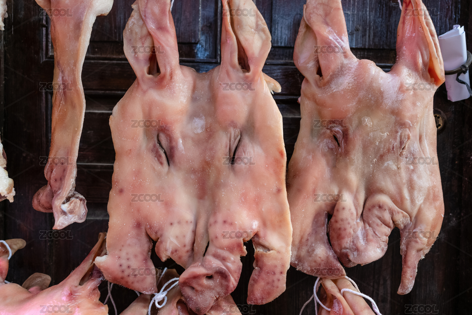 中国传统菜市场上铁钩子上悬挂售卖的猪肉