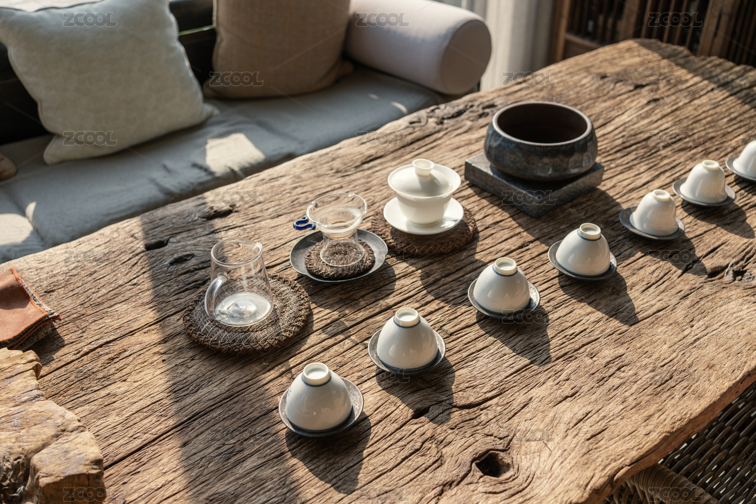 摆放在茶几上的成套青瓷茶具及其他装饰品