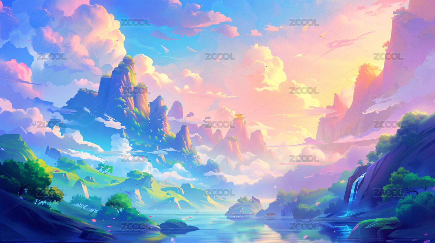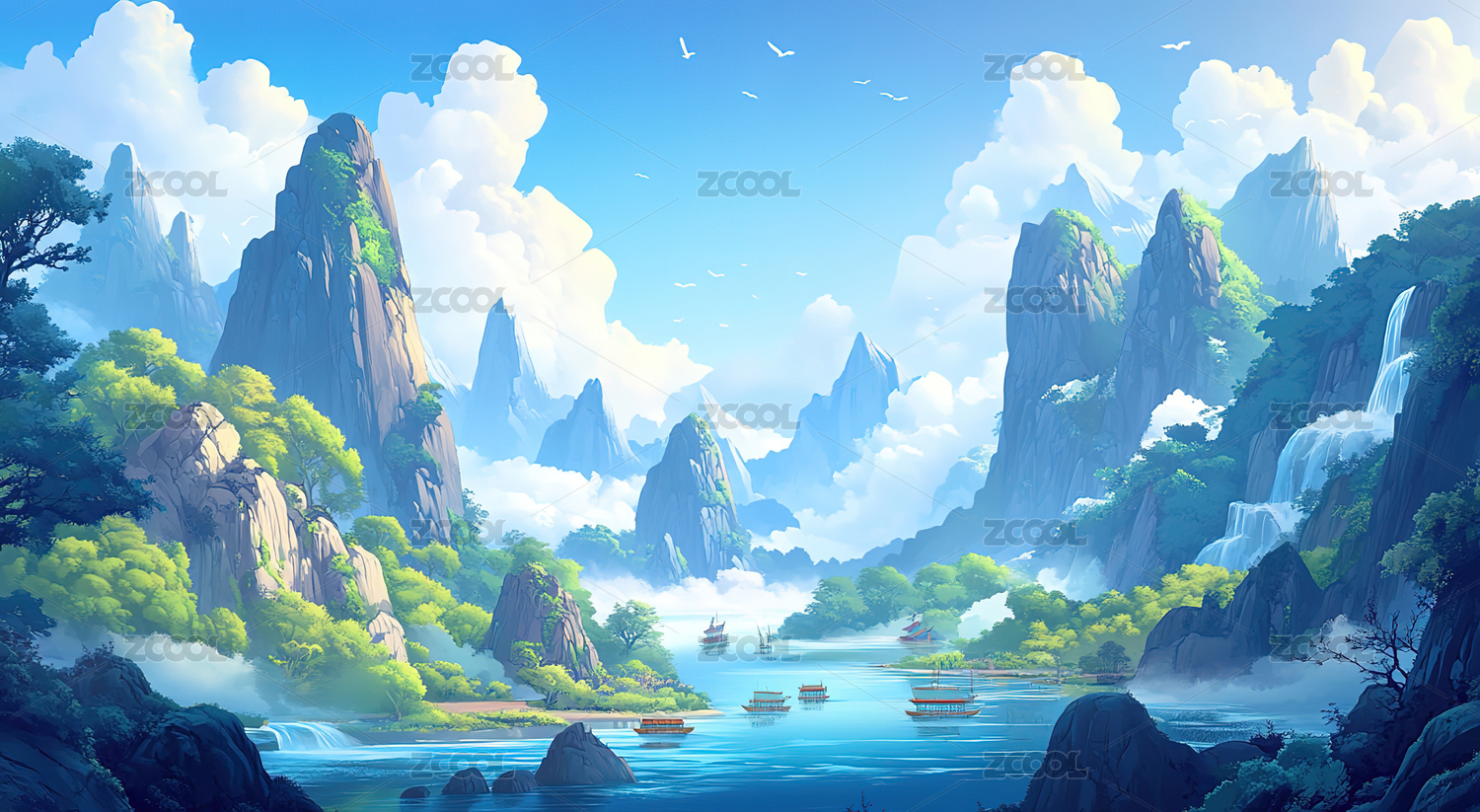 松树,山水,风景,森林,树木,国风,宁静,云,山峰,瀑布