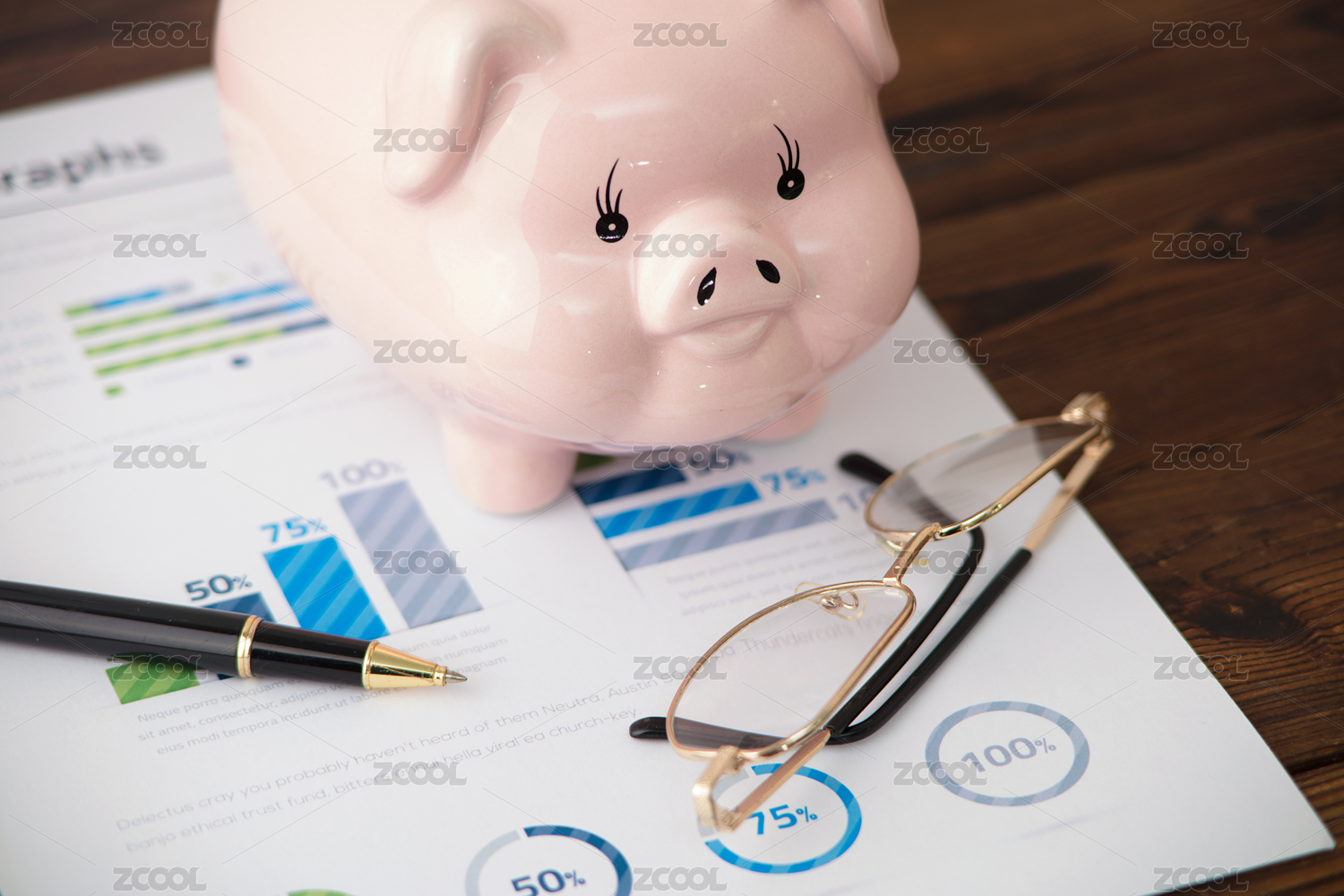 放在财务数据报表上的存钱罐、钢笔和计算器
