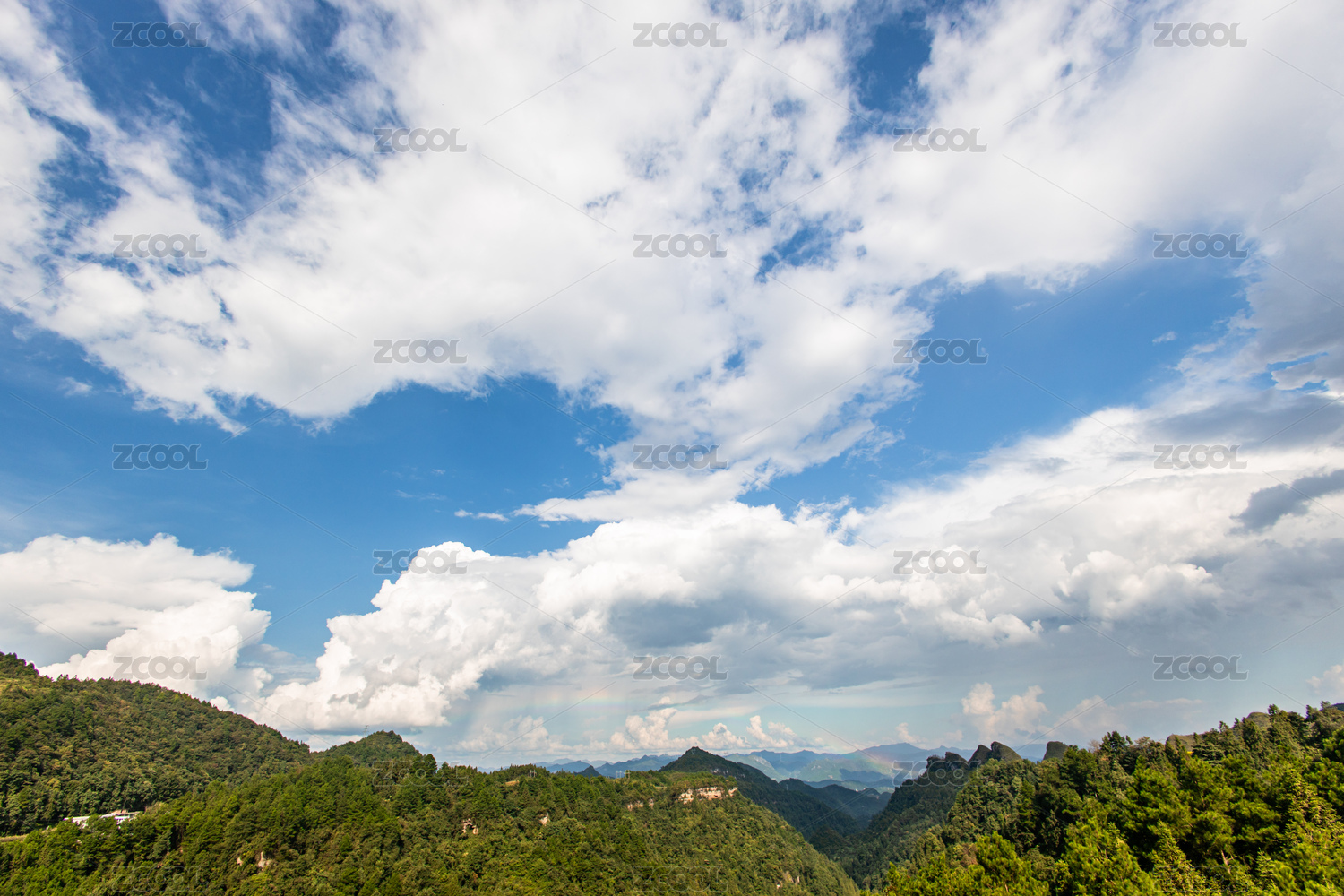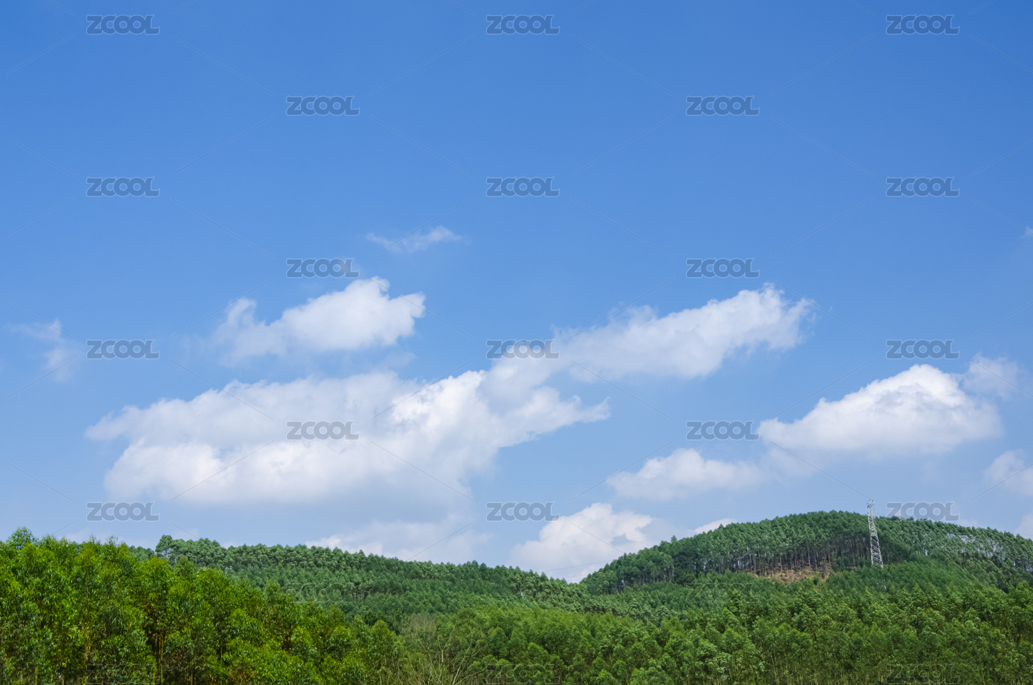夏季蓝天白云下辽宁大连公园的树林山坡