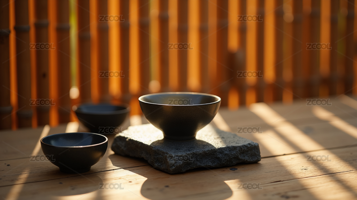 盖碗茶三才杯摆放在窗棂影木桌面上