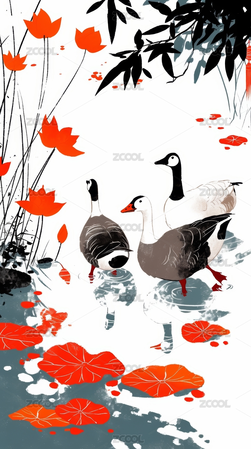 冬季芦苇丛中一只大雁寒露节气中国风插画