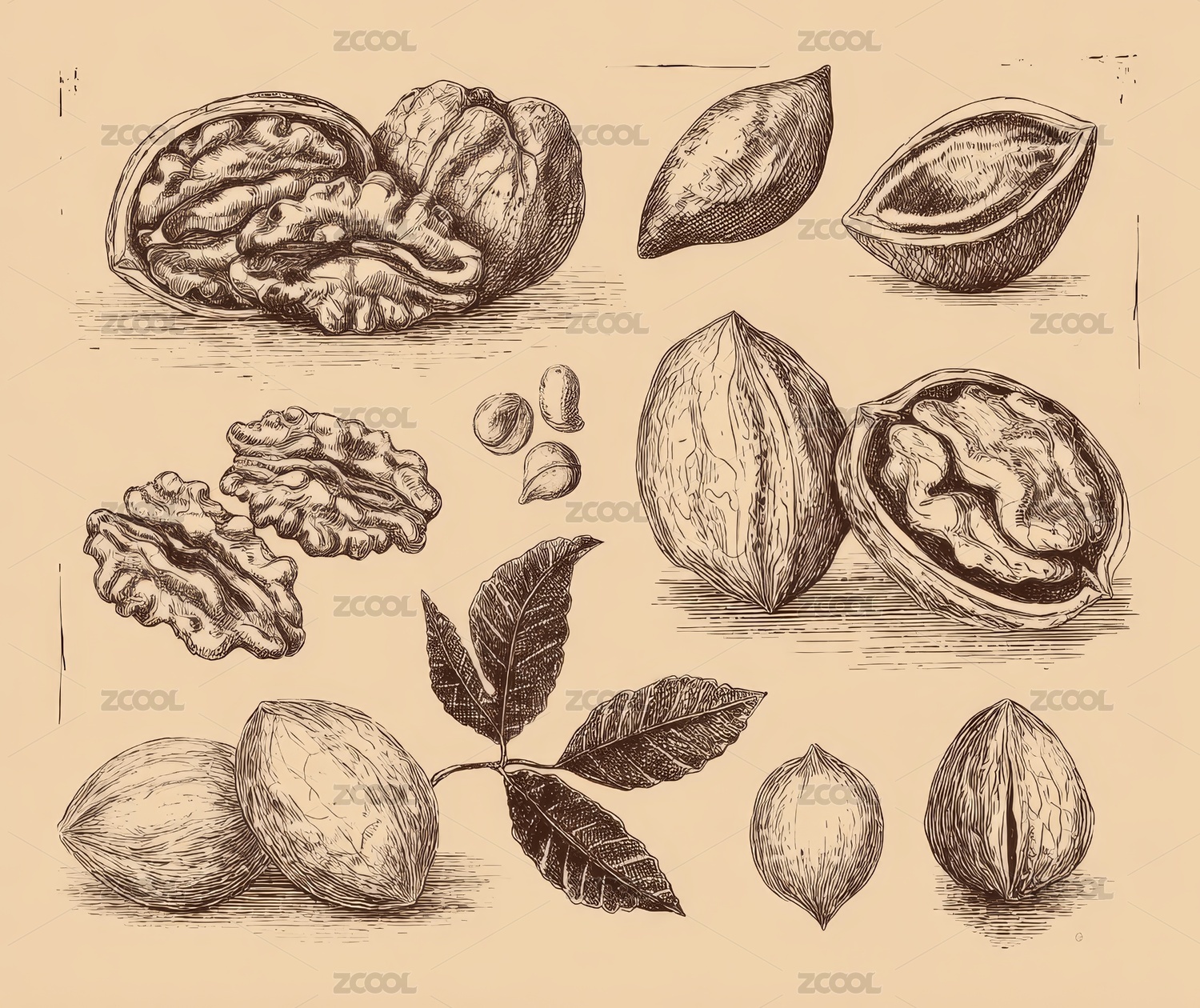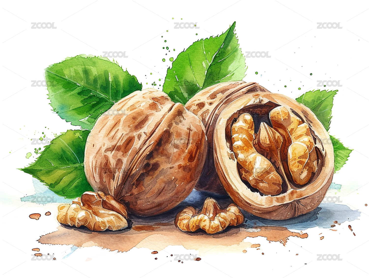 核桃,坚果,叶子,手绘,插图,食物,农业,自然,健康,营养