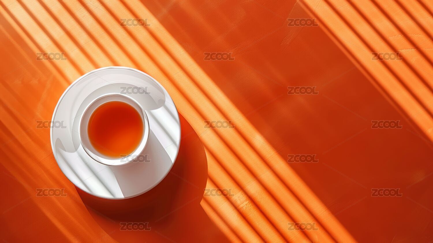 白色杯子盛了红茶放在橙色和蓝色背景上
