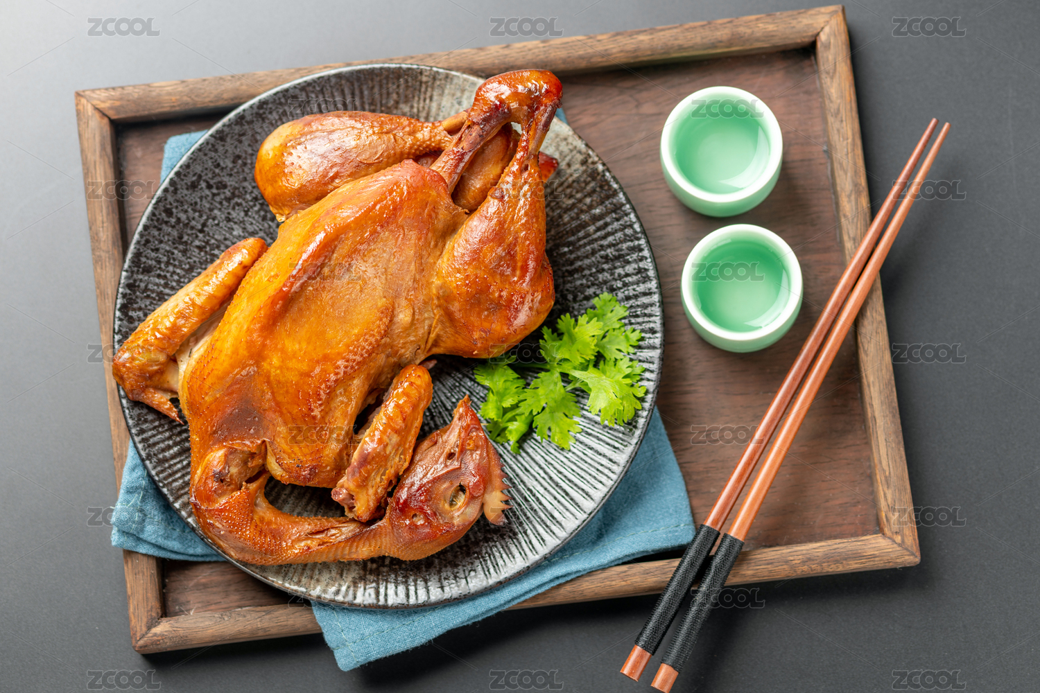 一盘整只的烧鸡和酒杯摆放在木桌面上