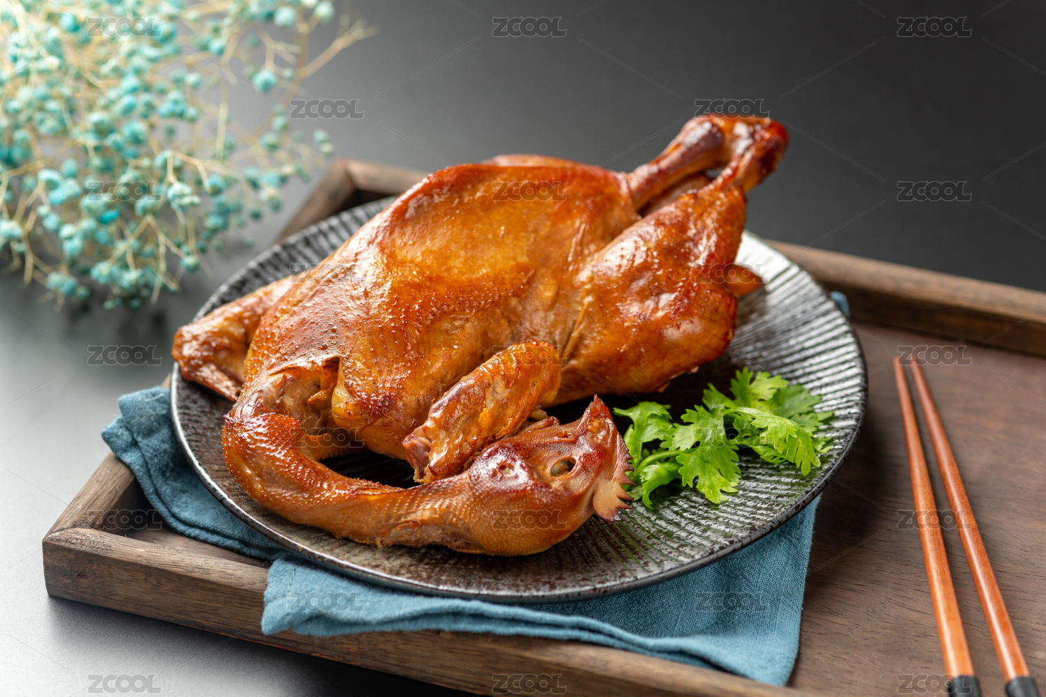 放在盘子中的整只烧鸡摆放在黑色背景上