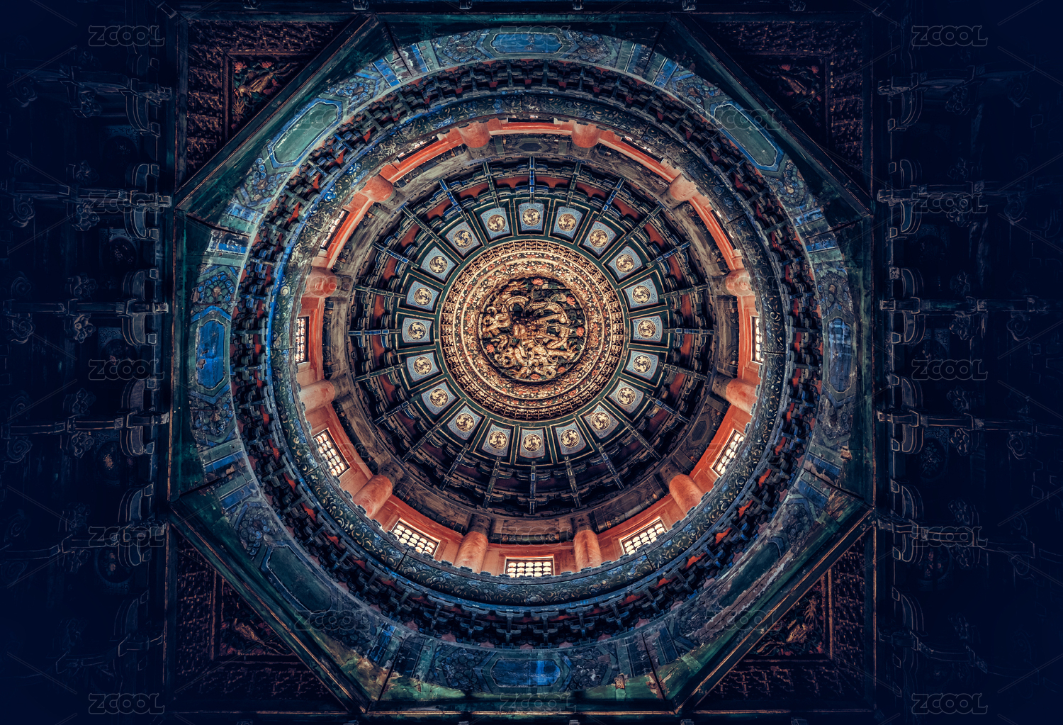 紫禁城故宫御花园万春亭蟠龙藻井光影光束